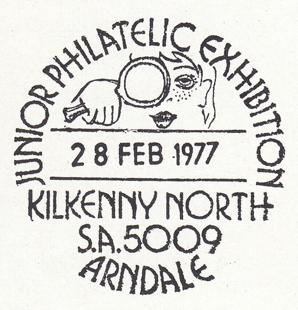 A pictorial postmarker was used at a temporary post office at Arndale Shopping Centre, Kilkenny, S.A. for the Junior Philatelic Exhibition, held between 28th February to 12th March, 1977, to cancel 1,954 articles.