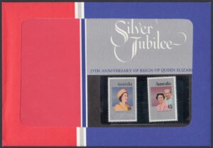 Australia issued a set of two stamps, of 18c and 45c denominations, on 2nd February, 1977, to commemorate the 25th Anniversary of the Queen’s Reign. Stocks of the stamps were on sale at post offices from the issue date until late March, so that they were available during the Queen’s visit to Australia in March 1977 (normally commemorative issues are sold at post offices for about two weeks). The stamps continuing on sale at Australia Post philatelic sales centres for up to twelve months from the issue date, providing stocks last.