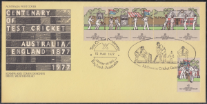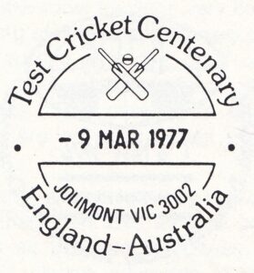 During the period 9th to 17th March, 1977, a special postmarker was used at a temporary post office established at the Melbourne Cricket Ground for the Australia-England test cricket centenary match. The temporary post office provided at the venue, was a re-creation of a nineteenth century post office.