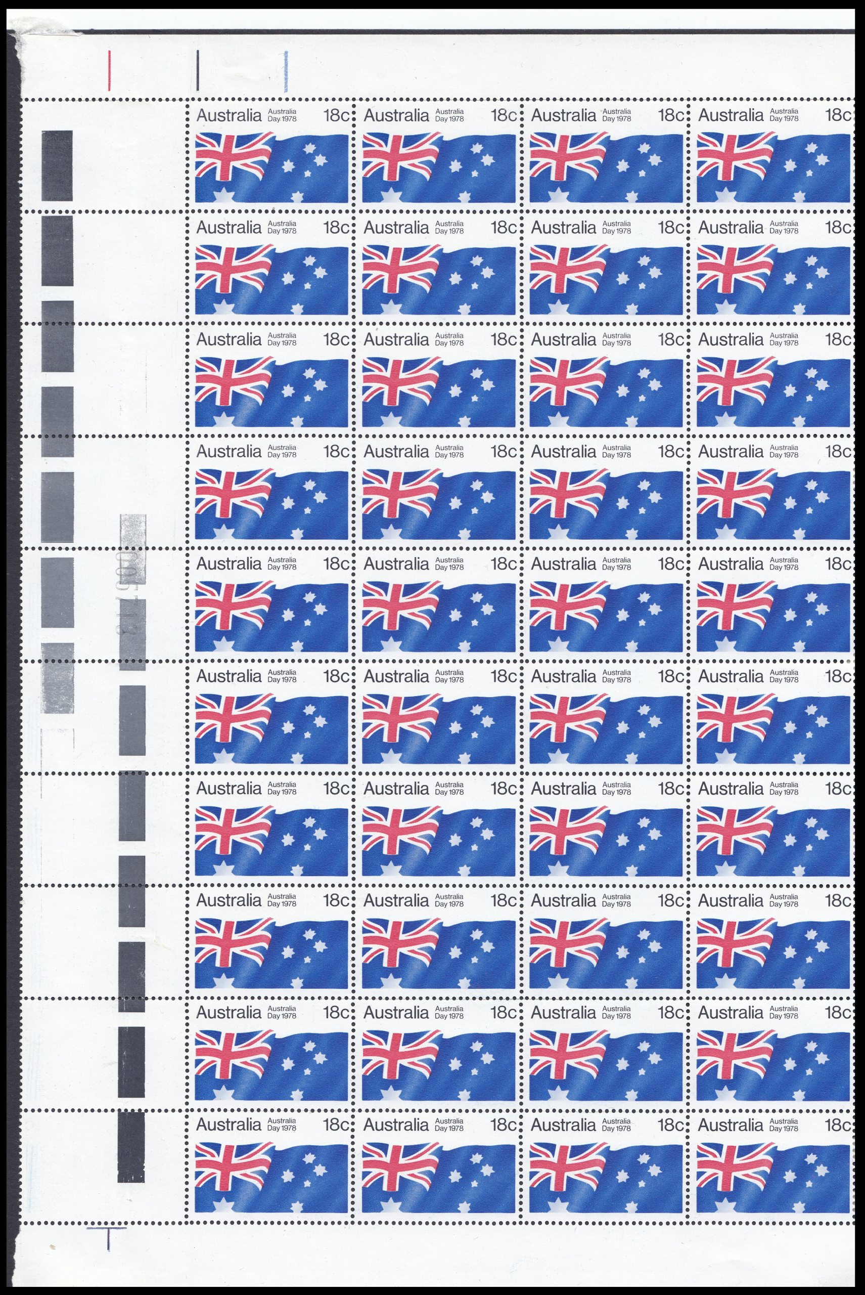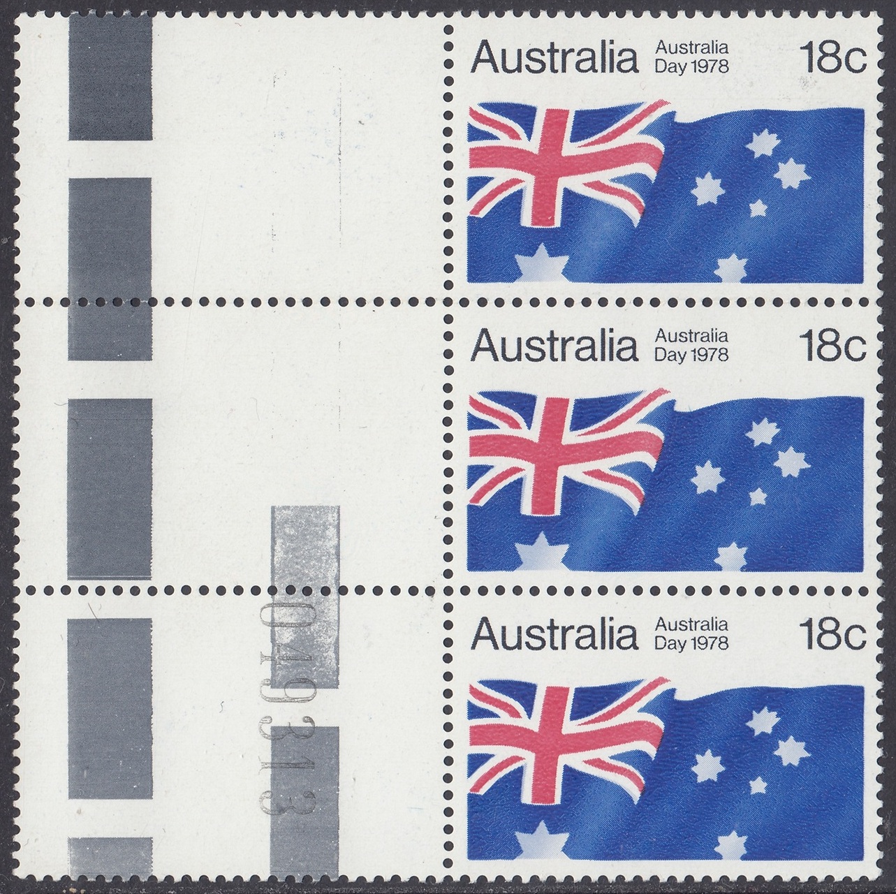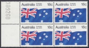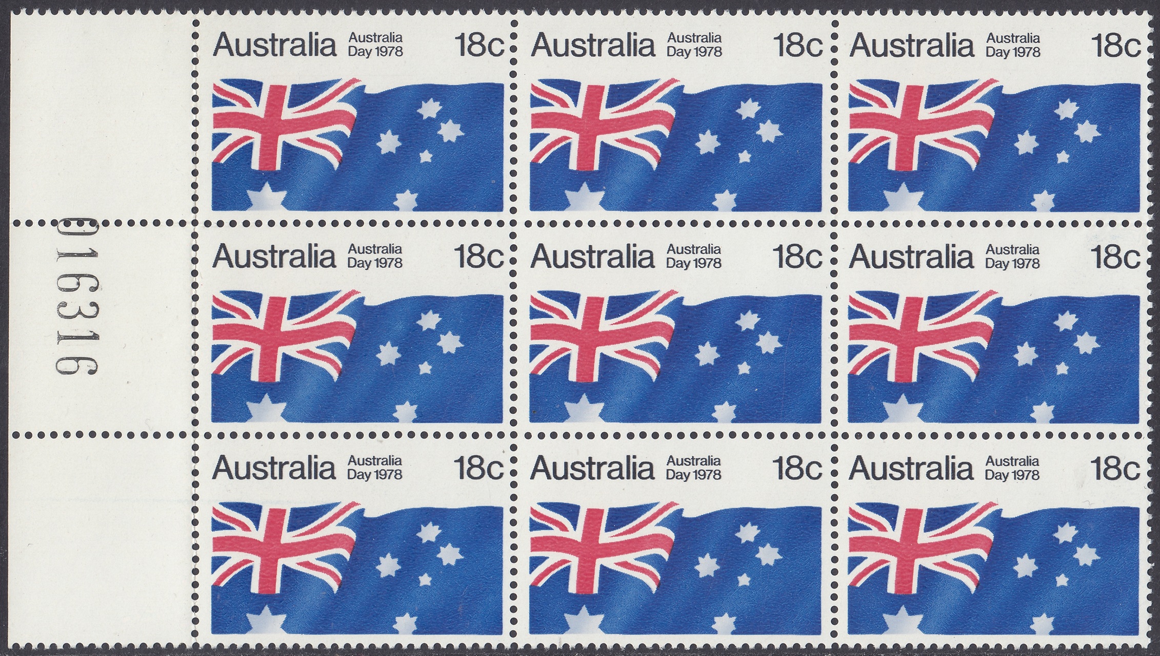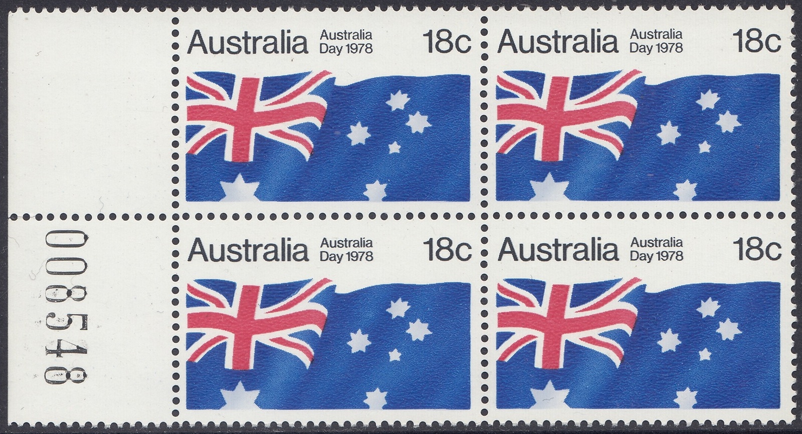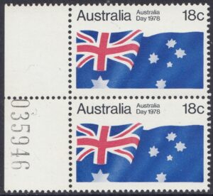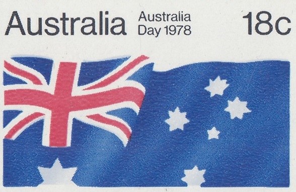 An 18c stamp commemorating Australia Day was issued on 26 January 1978. The stamp was on sale for approximately two weeks at post offices and is available from Australia Post philatelic sales centres until 26 January 1979, providing stocks last. The stamp, in horizontal format, depcits the Australian National Flag.