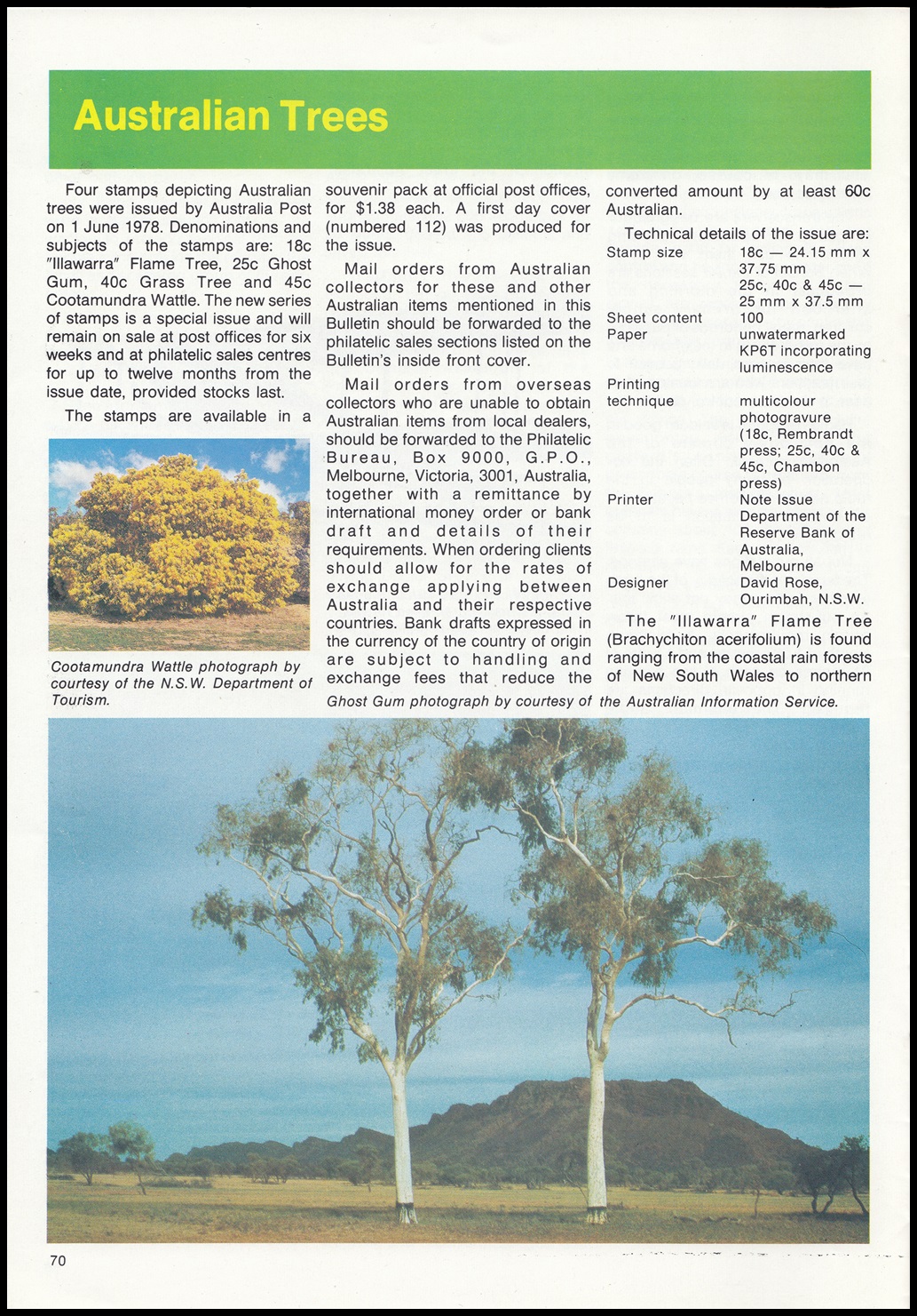 Four stamps depicting Australian trees were issued by Australia Post on 1 June 1978. Denominations and subjects of the stamps are: 18c “Illawarra” Flame Tree, 25c Ghost Gum, 40c Grass Tree and 45c Cootamundra Wattle. The new series of stamps is a special issue and will remain on sale at post offices for six weeks and at philatelic sales centres for up to twelve months from the issue date, provided stocks last.