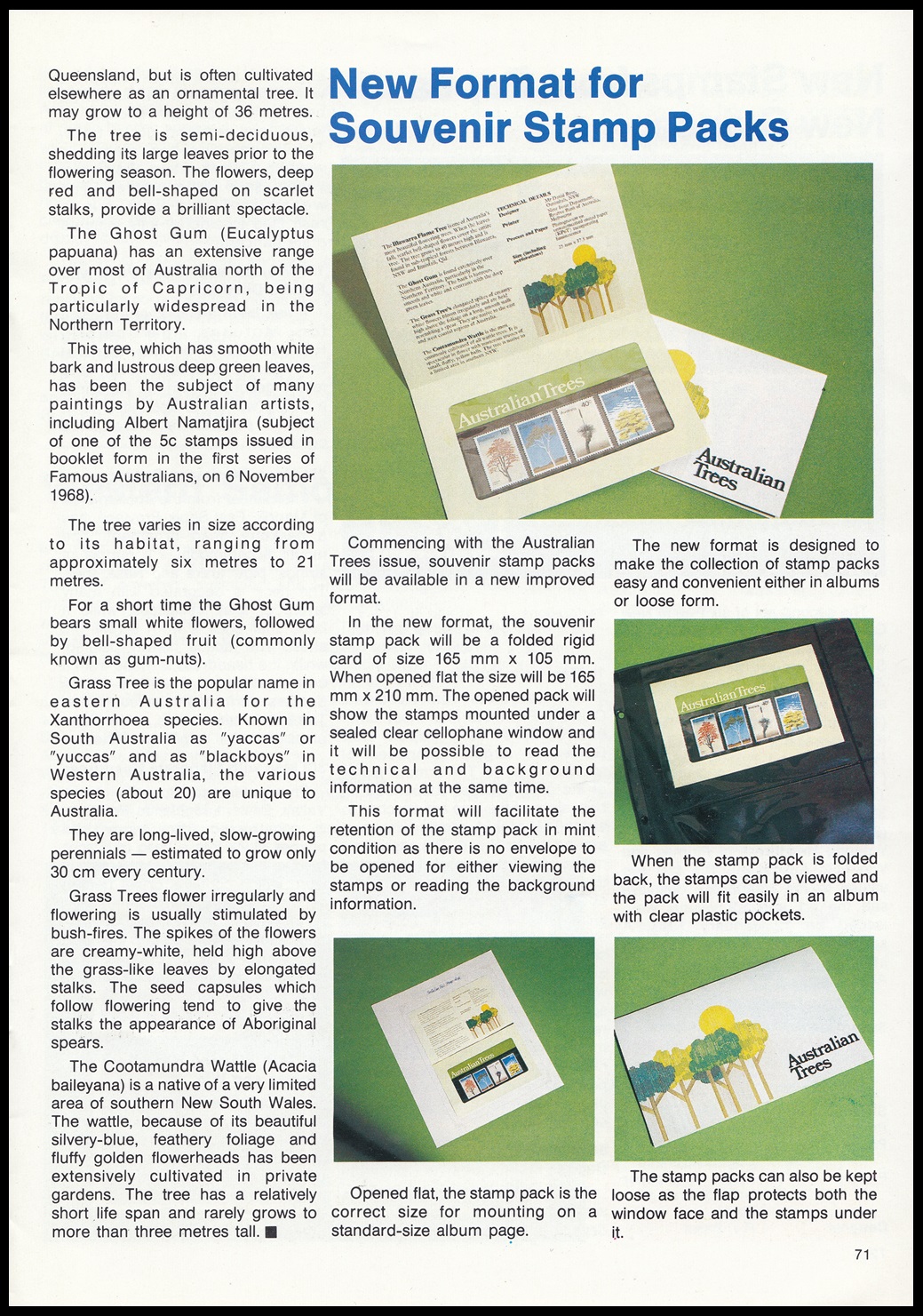 Commencing with the Australian Trees issue, souvenir stamp packs will be available in a new improved format.