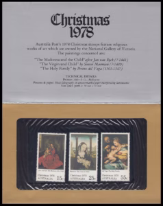 The 25c features “The Madonna and the Child” (after van Eyck), the 25c features “The Virgin and Child” (Marmion) and the 55c stamp features “The Holy Family” (del Vaga). All three paintings are housed in the National Gallery of Victoria and were acquired by the Felton Bequest.