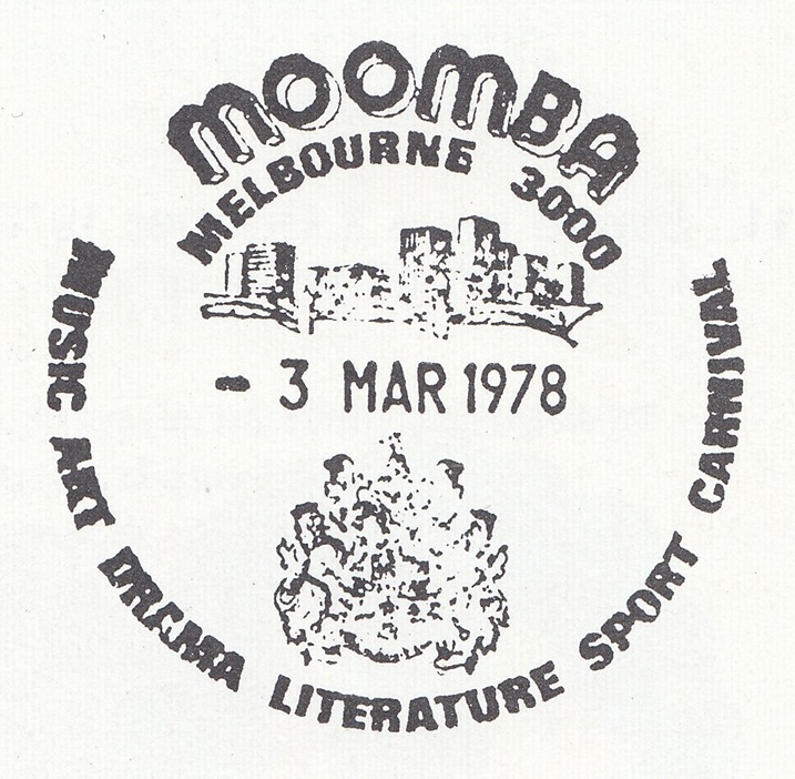 From 3 to 13 March 1978, a special postmarker was used at a temporary post office in the Treasury Gardens, Melbourne, Vic., to cancel 4426 articles, including 16 registered, during the 1978 Moomba Festival.