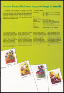 On 11 September 1978 Australia Post will introduce a series of seven pre-stamped envelopes to replace the current embossed envelopes. The set consists of seven gorgeous birds of Australia painted in full colour by Marg Towt of Melbourne. The paintings have been reduced to stamp size and printed on high quality white paper with a 20c denomination and then made into envelopes. They will save you the trouble of remembering to buy stamps and envelopes separately. All you need to do is write the address and mail it . . . a beautiful time saving and easy way to keep in touch!
