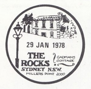 On 29 January 1978 a pictorial postmarker was used to cancel 2197 articles, at the temporary post office provided for the Australia Day Festival held at “The Rocks”, Sydney, N.S.W.