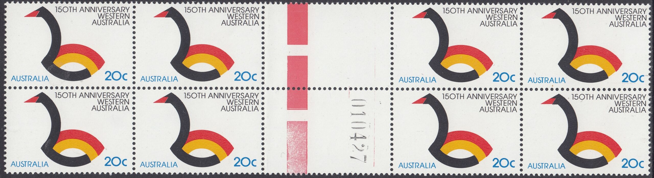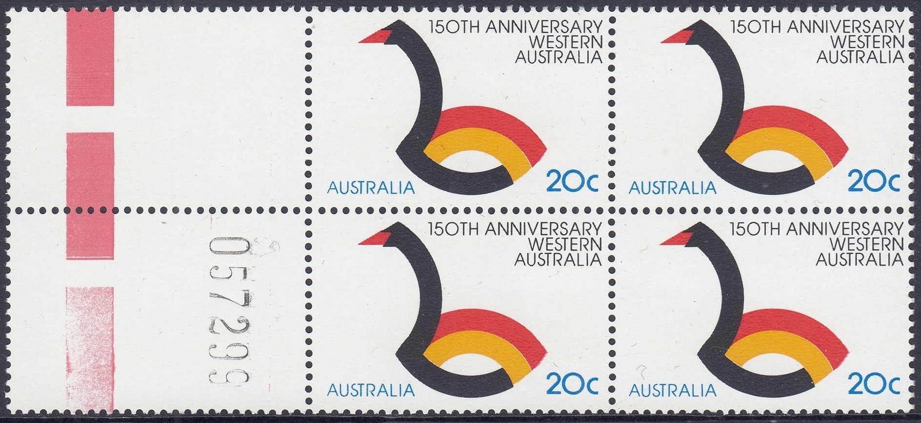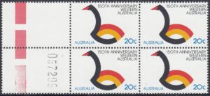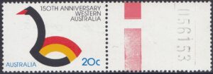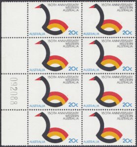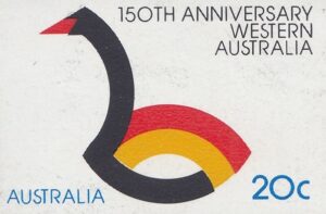 Western Australia is Australia’s largest state. It covers an area over 2.5 million square kilometres and has a 7,000 kilometre coastline. This year Western Australia is celebrating the 150th anniversary of its foundation and a 20c stamp will be issued on 6 June 1979 to commemmorate the ses-quincentenary. The stamp was designed by Bruce Weatherhead of Melbourne and embodies the State’s official anniversary symbol. This symbol has been adapted from Western Australia’s traditional symbol – the black swan. It incorporates the colours red and gold to depict the State’s sunset and beaches. Norman Wilson of Perth designed the official anniversary symbol.