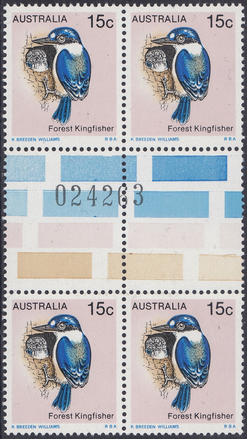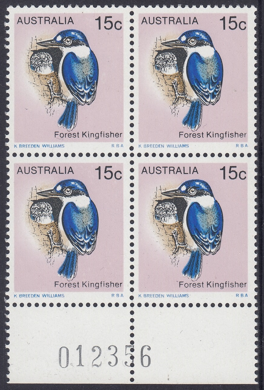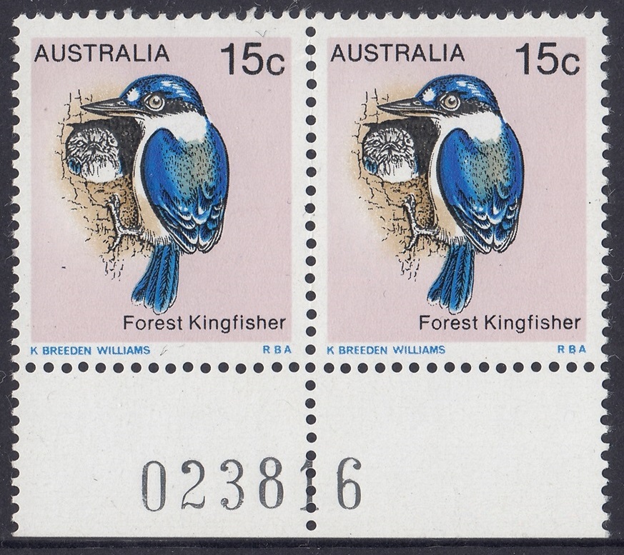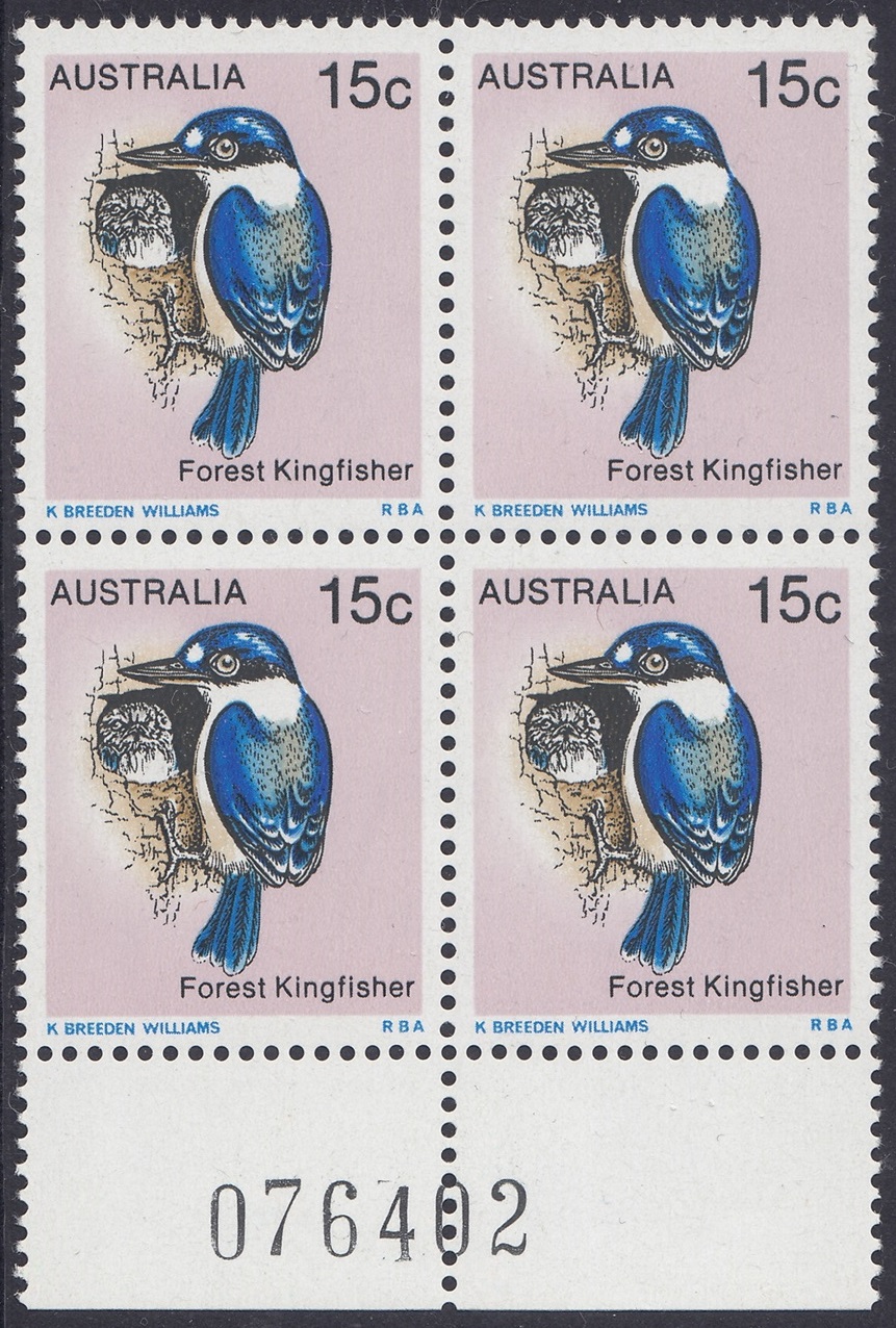 The Forest Kingfisher (Halcyon macleayii) shown on the 15c stamp is found mainly along the northern part of eastern Australia and in the far north of the Northern Territory. The forest kingfisher is moderately abundant in these areas and lives in open forests and woodlands. The more southern population of this kingfisher tends to be migratory and flies north to New Guinea in winter, returning to breed in warmer weather. The kingfisher nests in hollow or rotten tree branches or in tree termite mounds.