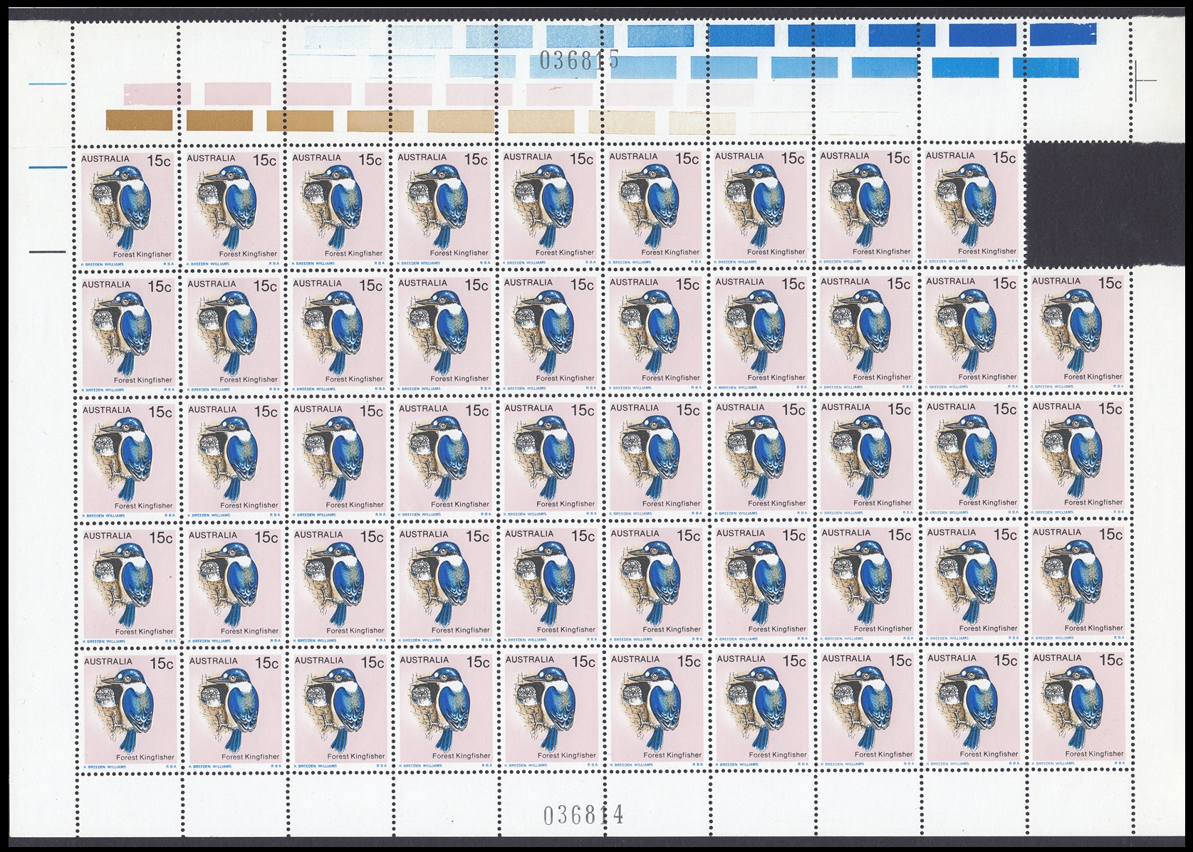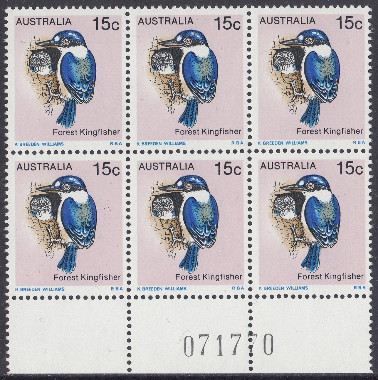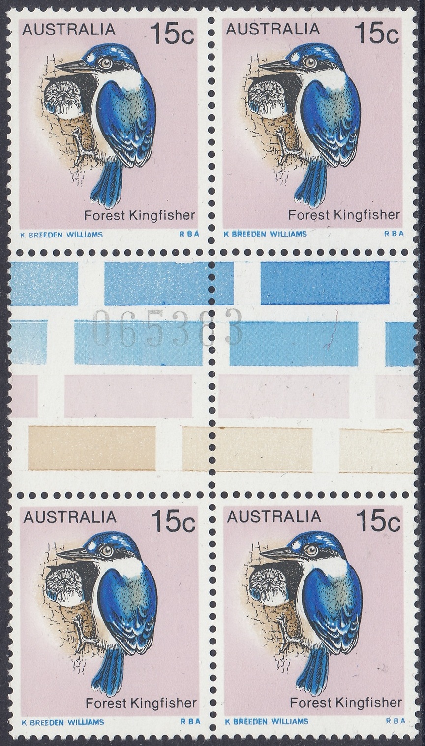 The Forest Kingfisher (Halcyon macleayii) shown on the 15c stamp is found mainly along the northern part of eastern Australia and in the far north of the Northern Territory. The forest kingfisher is moderately abundant in these areas and lives in open forests and woodlands. The more southern population of this kingfisher tends to be migratory and flies north to New Guinea in winter, returning to breed in warmer weather. The kingfisher nests in hollow or rotten tree branches or in tree termite mounds.