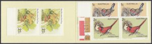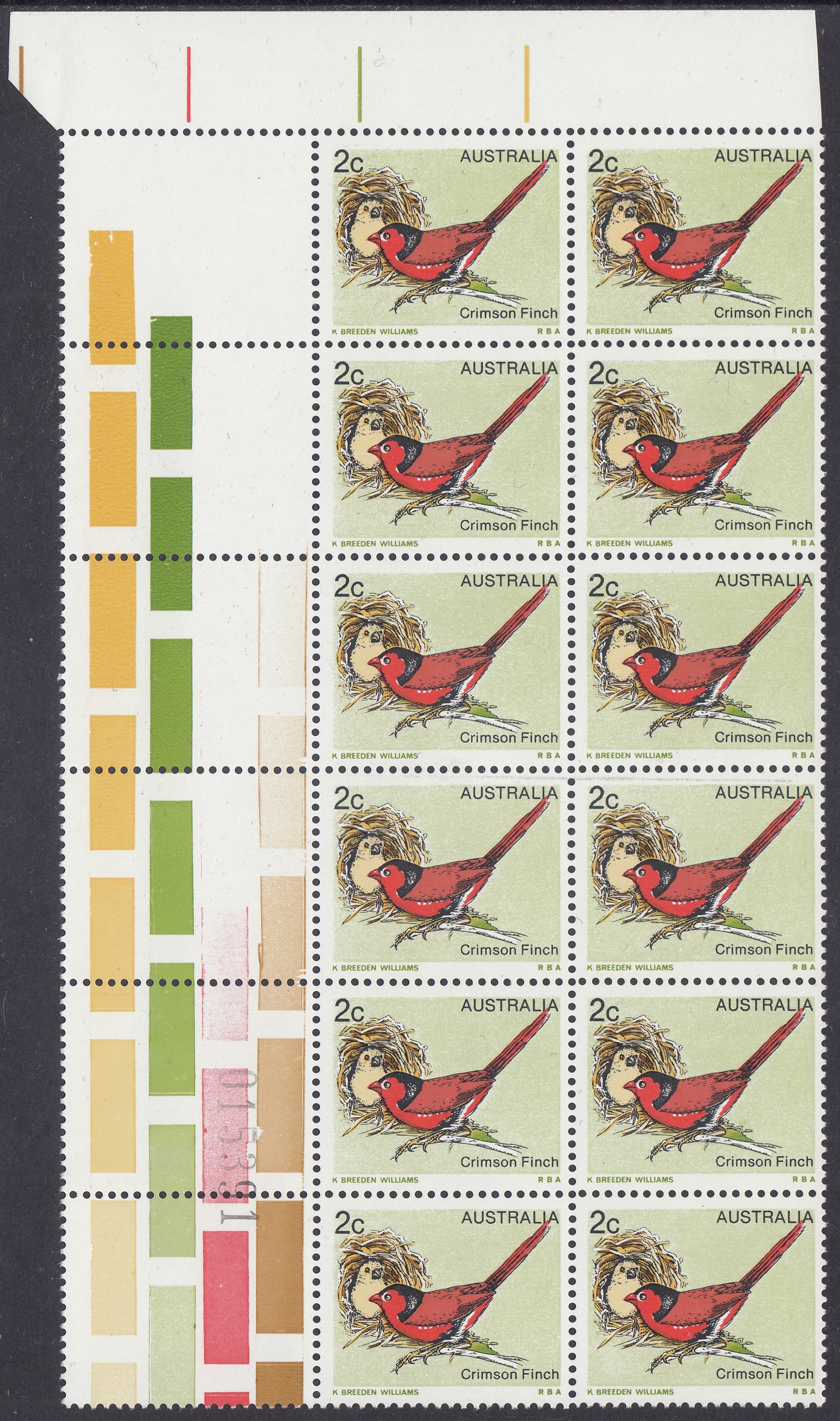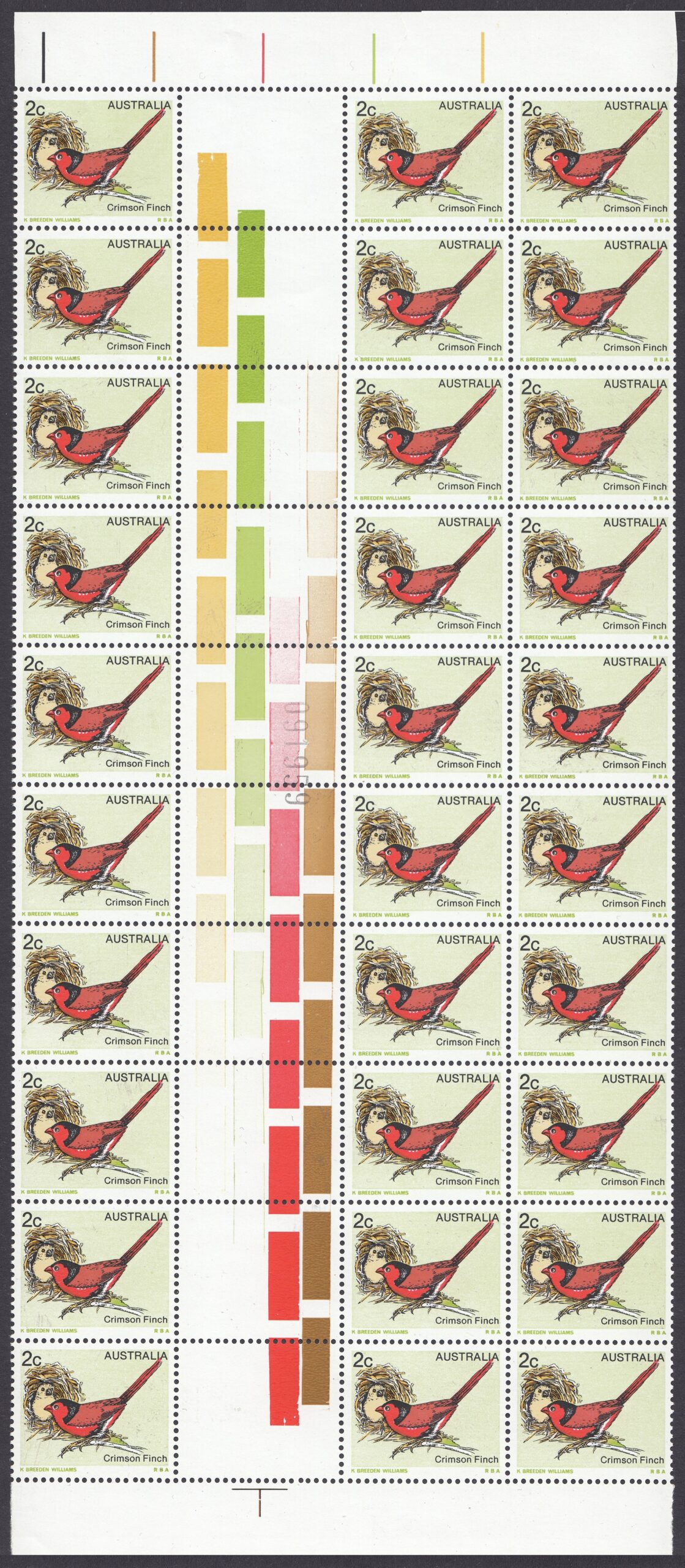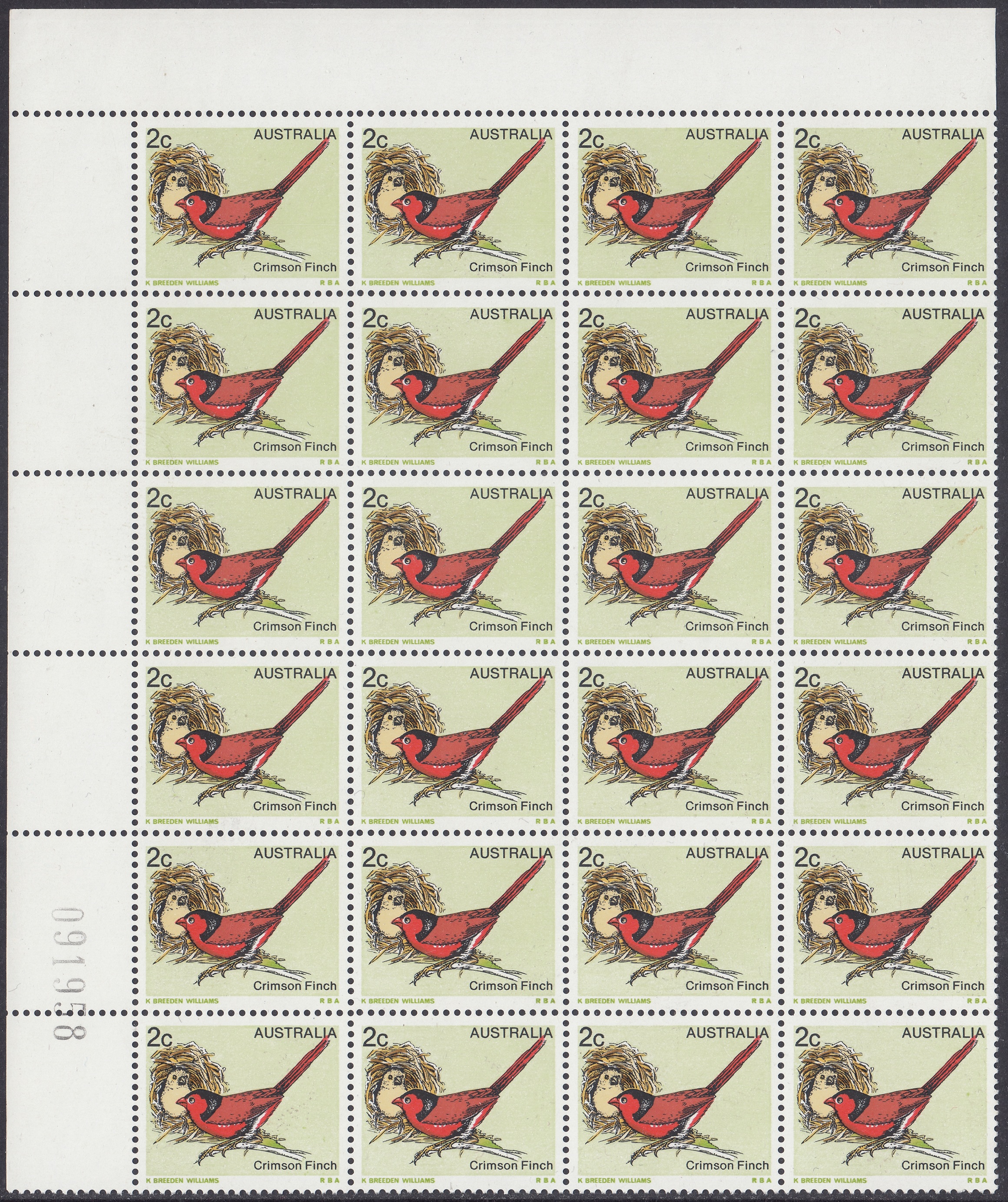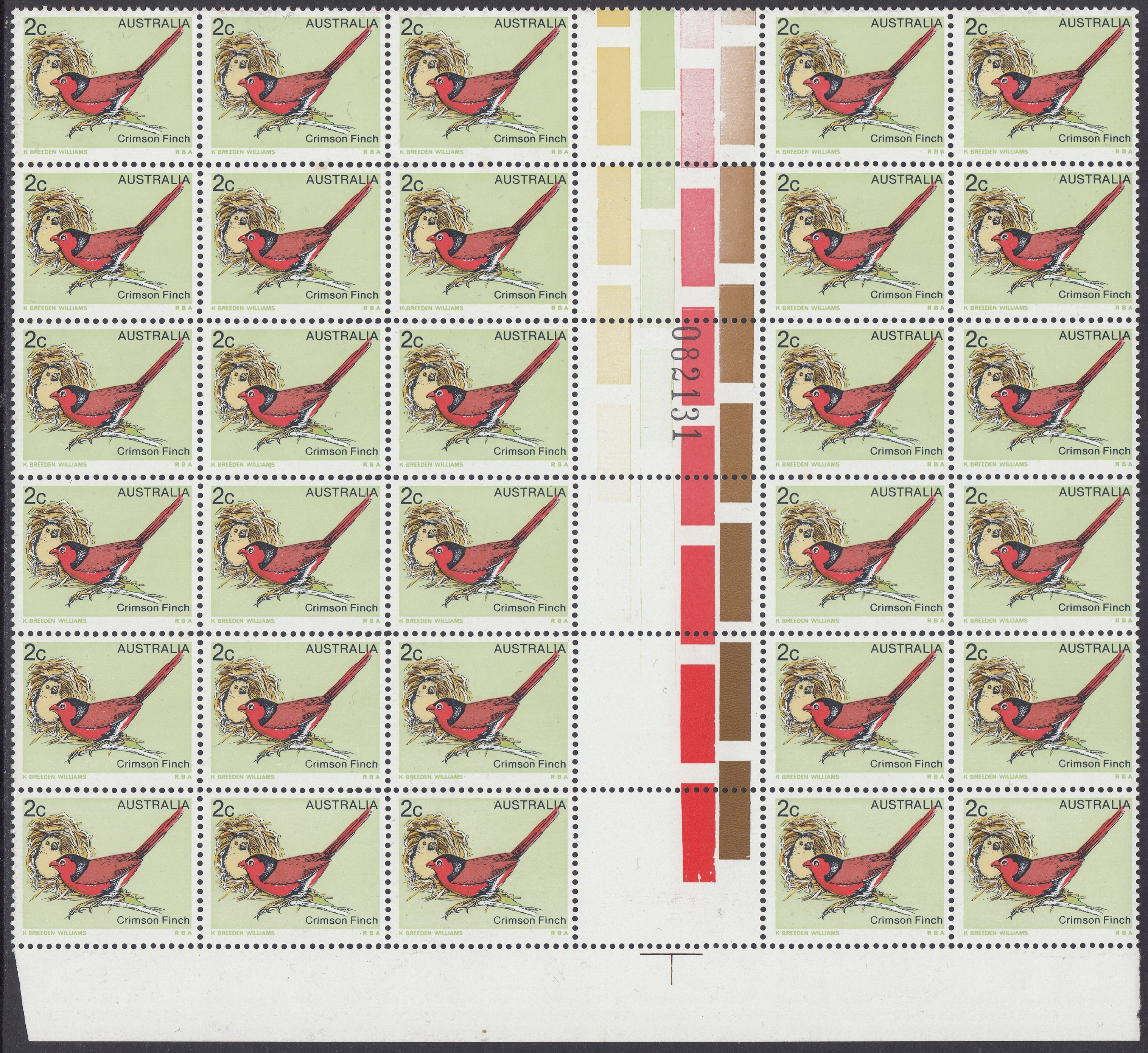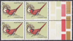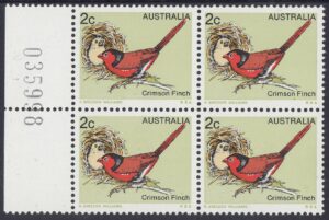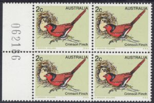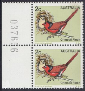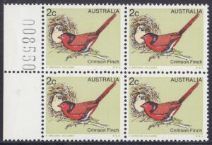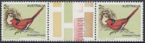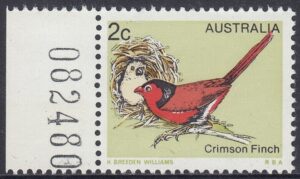 The Crimson Finch (Neochmia phaeton) depicted on the 2c stamp is found mainly on the watercourses along the central Queensland coast and in the far north of Australia. Although crimson finches are found near surface water they rarely drink it, preferring to take the dew from leaves or blades of grass. This finch has a noted preference for nesting in the cracks and crevices of buildings. This anti-social finch is a most aggressive member of the species and will attack and repel larger birds from its nest.