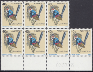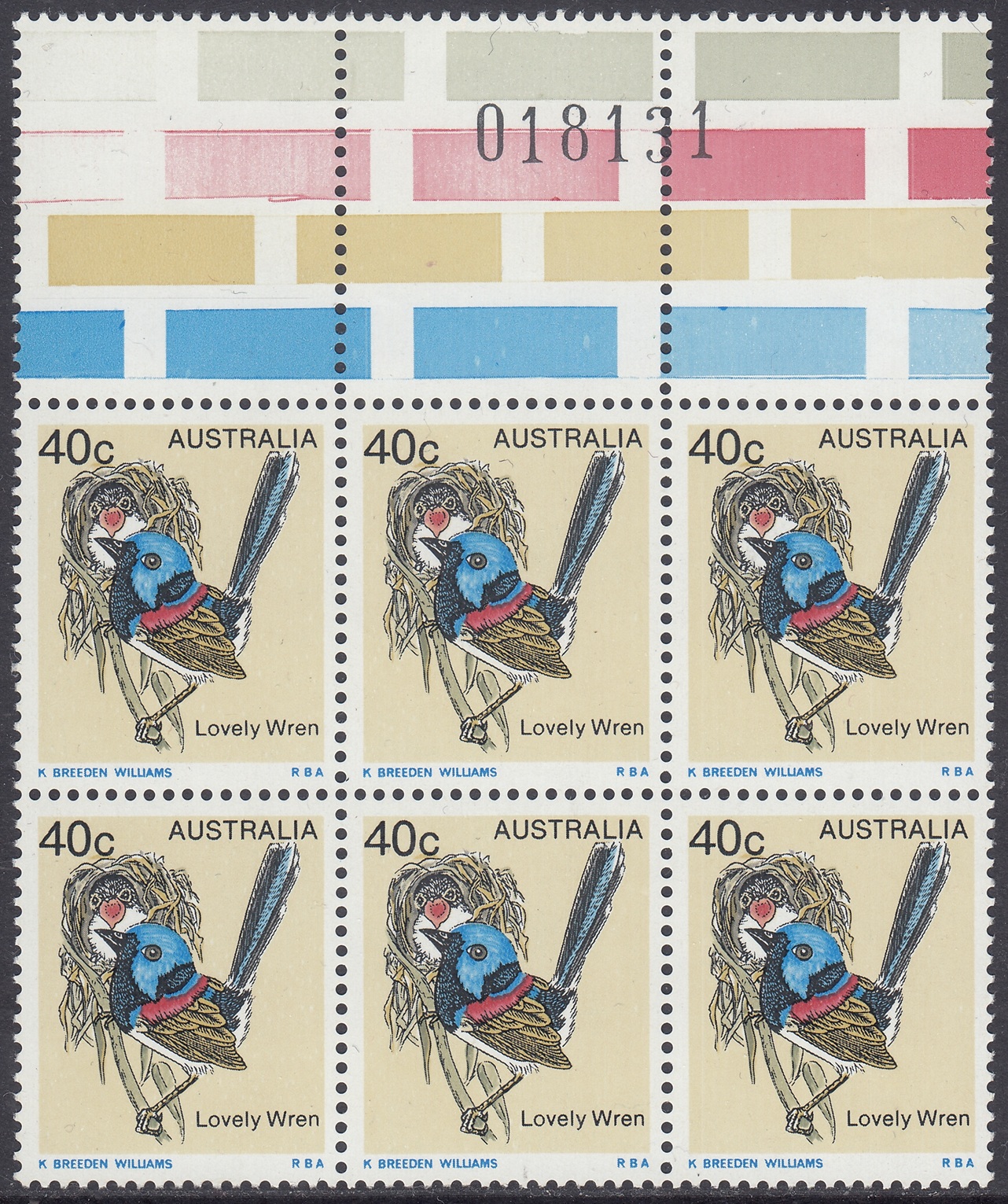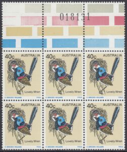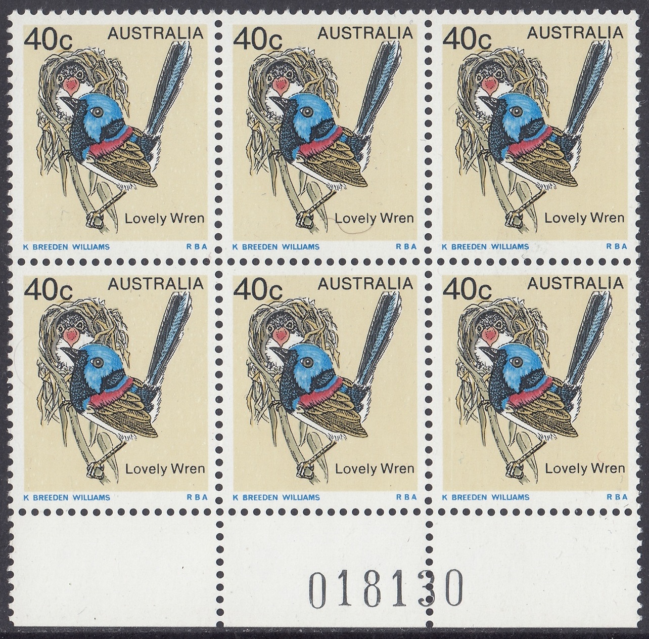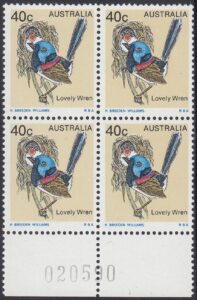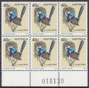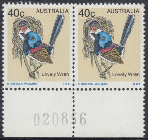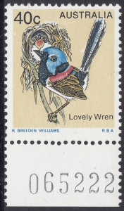 The Lovely Wren (Malurus lamberti amabilis) featured on the 40c stamp is a tropical form of the variegated wren species and lives on the Cape York peninsula in northern Queensland. The wren’s breeding season and the nest, constructed from grass and spider egg-sacs, is normally situated close to the ground. The brilliantly coloured male wren loses his blue colouring in the non-mating season.