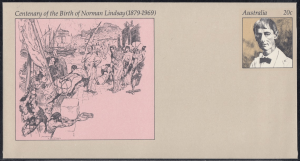 A pre-stamped envelope will be issued on 22 February 1979 to commemorate the centenary of the birth of Norman Lindsay. Lindsay displayed his versatility in his works as a painter, etcher, illustrator, cartoonist, writer, sculptor and model-maker. It is, however, his controversial works of art and his children book – “The Magic Pudding”, for which is he is best remembered.