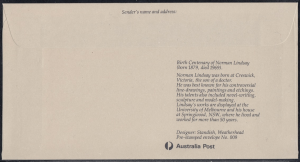 The stamp design on the pre-stamped envelope features a portrait of Lindsay by Melbourne artist, Bruce Weatherhead.The envelope is numbered 009 and measures 190 mm x 101 mm. It is available for $A0.25 over the counter at all Australia Post philatelic sales centres for twelve months from the issue date, provided stocks last.