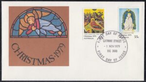 Australia Australia Philately: 1979 Christmas (II) – First Day Cover No.135 (VIC) thedigitalphilatelist 01/11/1979 3000 – LATROBE STREET 3000 – PHILATELIC BUREAU 3153 – BAYSWATER 3192 – SOUTHLAND CENTRE 3250 – COLAC