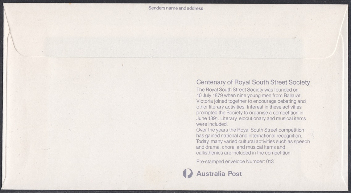 The Centenary of the Royal South Street Society will be commemorated on the pre-stamped envelope being released on 24 September 1979.