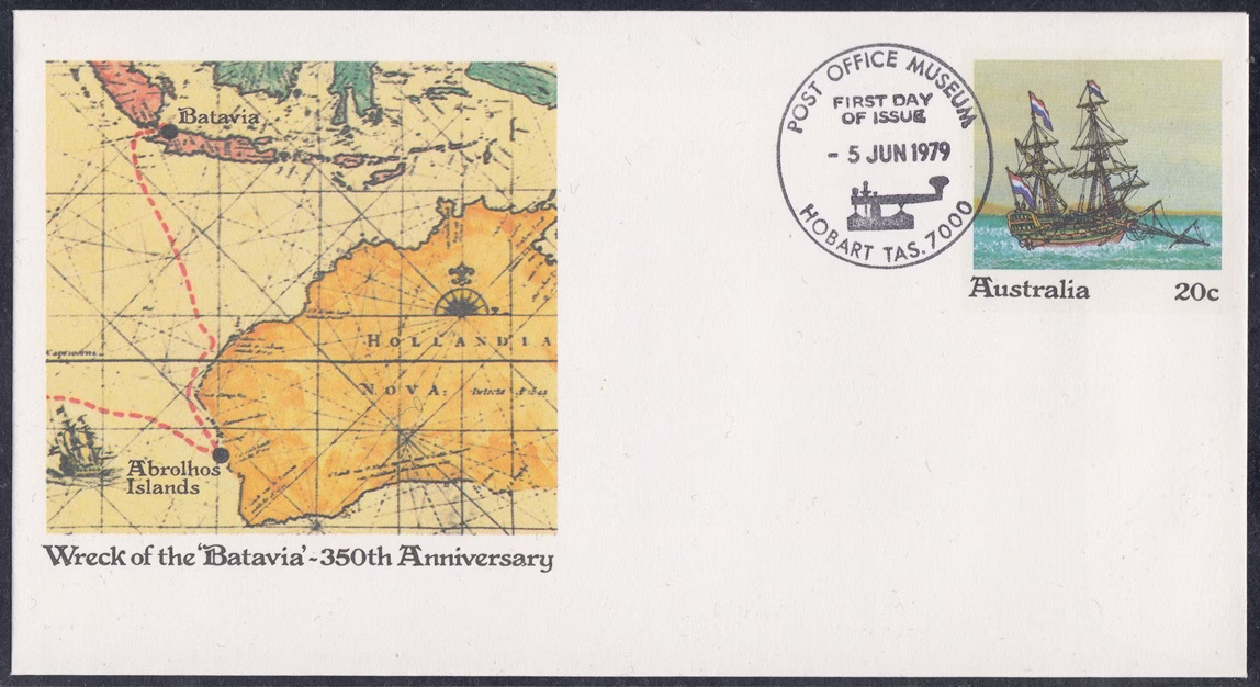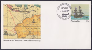 Australia Australia Philately: 1979 Wreck of ‘Batavia’ 350th Anniversary – First Day of Issue (TAS) thedigitalphilatelist 05/06/1979 7000 – POST OFFICE MUSEUM HOBART Share this: Share on Facebook (Opens in new window) Facebook Share on X (Opens in new window) X Like this:Like Loading... Related
