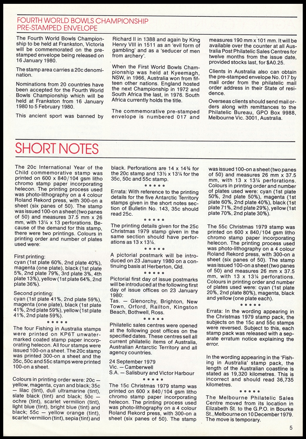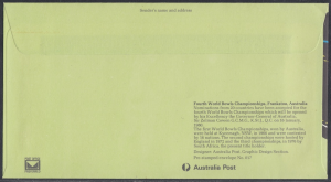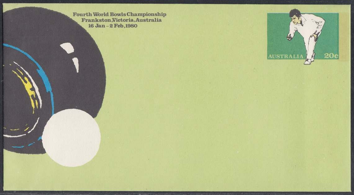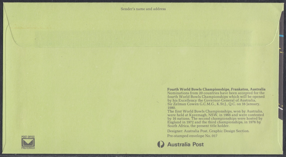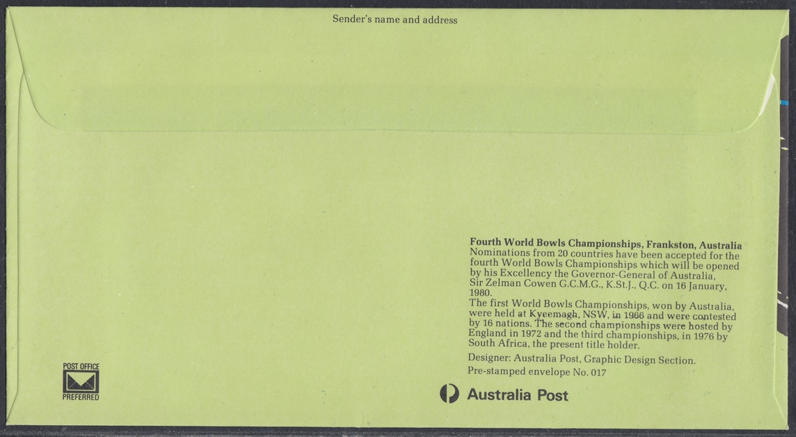 The Fourth World Bowls Championship to be held at Frankston, Victoria will be commemorated on the pre-stamped envelope being released on 16 January 1980.