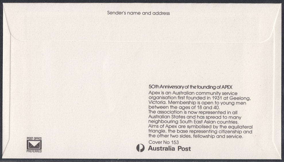 Australia Post will issue a commemorative stamp on 6 April 1981 to celebrate the 50th Anniversary of the Founding of Apex, an Australian young men’s service club.