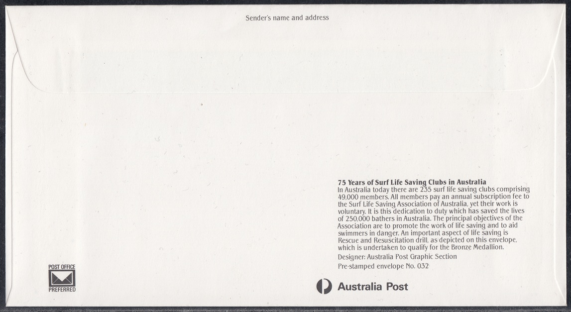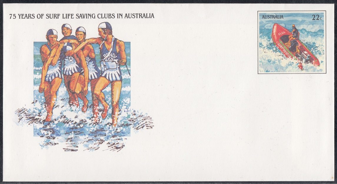 Australia Post will pay tribute to 75 Years of Surf Life Saving Clubs in Australia with the issue of the commemorative pre-stamped envelope on 4 February 1981. The envelope carries a 22c denomination and will cost A$0.28.