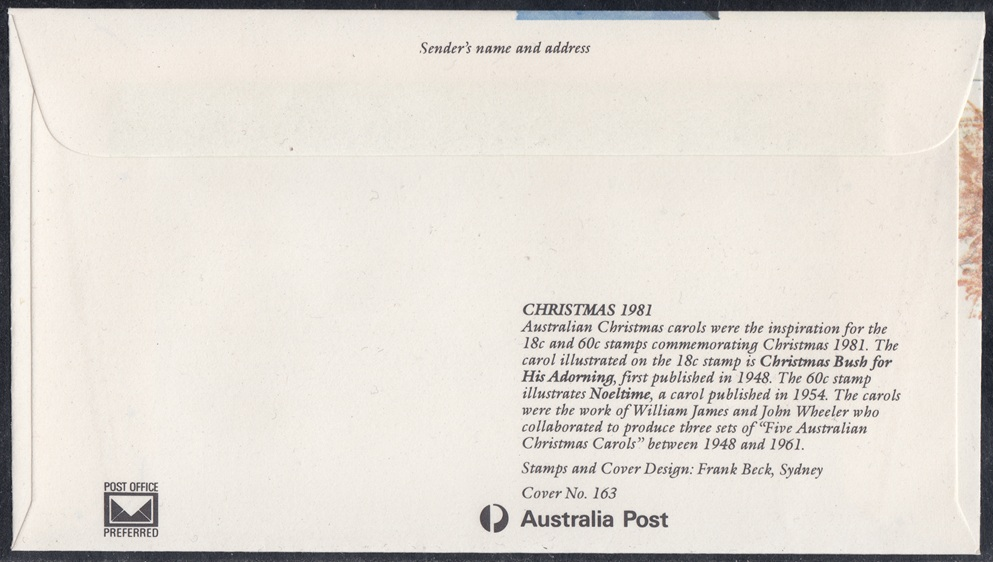 Unserviced covers (No. 163), measuring 165 mm x 92 mm, will be available for $A0.15 from 26 October 1981. Serviced covers, with the 18c and 60c Christmas 1981 stamps affixed and postmarked 2 November 1981, will be available for $A0.93 each from all first day of issue post offices until 13 November 1981, provided stocks last.