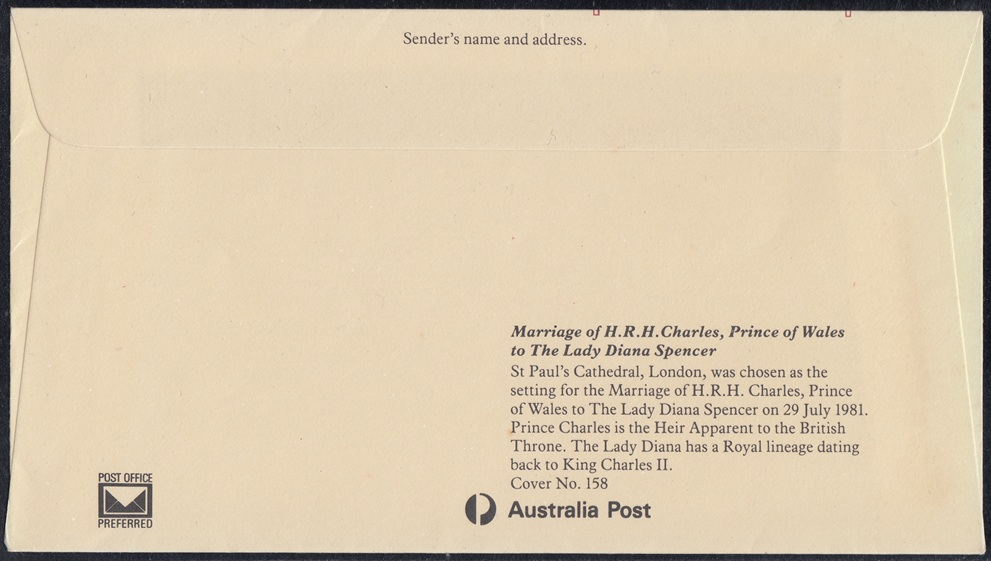 On 29 July 1981 His Royal Highness Charles, Prince of Wales, and the Lady Diana Spencer will be married in London’s St Paul’s Cathedral. The Archbishop of Canterbury, Dr Robert Runcie, will officiate at the wedding, which Australia Post will commemorate with the issue of two stamps.