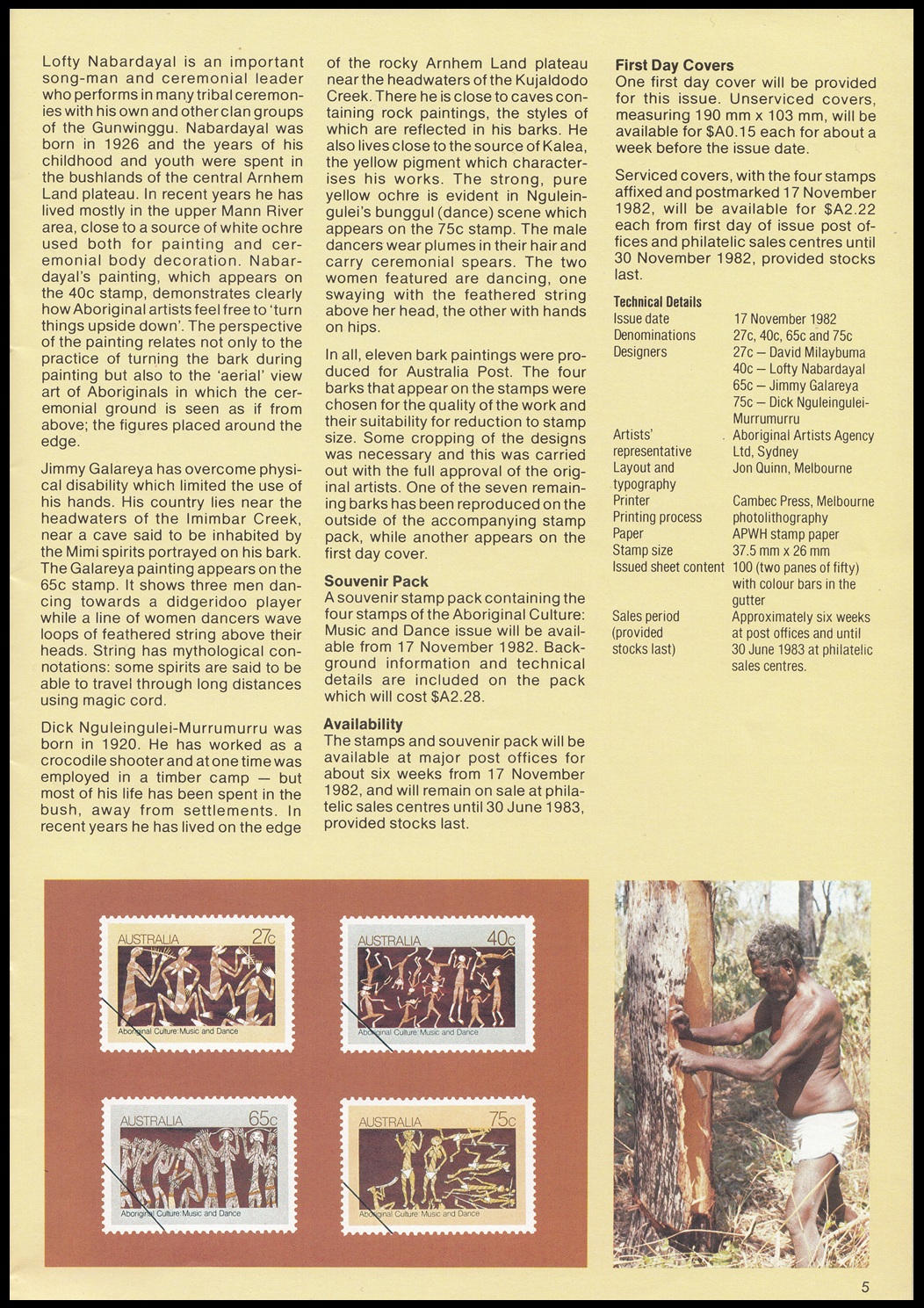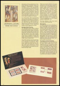 A souvenir stamp pack containing the four stamps of the Aboriginal Culture: Music and Dance issue will be available from 17 November 1982. Background information and technical details are included on the pack which will cost $A.2.28.