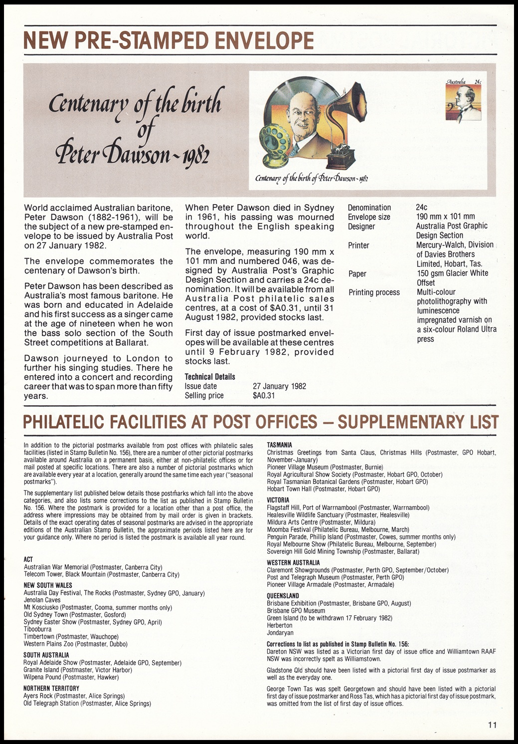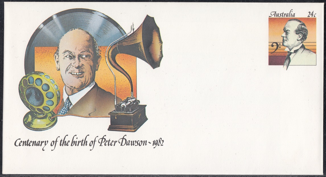 World acclaimed Australian baritone, Peter Dawson (1882-1961), will be the subject of a new pre-stamped envelope to be issued by Australia Post on 27 January 1982.