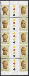 - Sheet: Issued in two sheets of 100 stamps in two panes (R10 x 5) separated by vertical gutter.