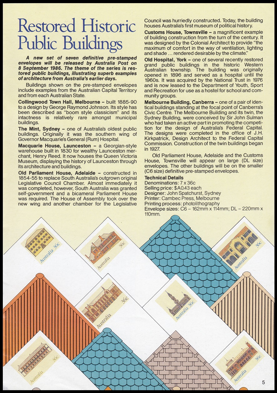 A new set of seven definitive pre-stamped envelopes will be released by Australia Post on 8 September 1986. The theme of the series is restored public buildings, illustrating superb examples of architecture from Australia’s earlier days.