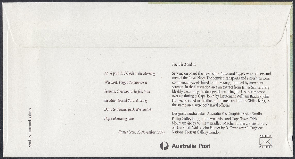 Two distinct groups of sailors manned the ships of the First Fleet. The naval vessels HMS Sirius and HMS Supply were manned by members of the Royal Navy. The six convict transports and three storeships were merchant vessels hired for the voyage and crewed by merchant seamen. On the envelope John Hunter’s portrait appears before a painting by Bradley of the Fleet at Cape Town and an extract from Scott’s journal. Philip Gidley King is portrayed in the stamp area.