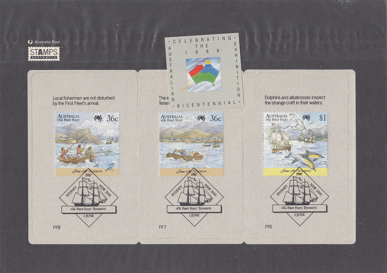 The first three sets cover the Departure of the First Fleet, The First Fleet at Teneriffe, and the First Fleet at Rio de Janeiro. Each set is priced at $2.00 and will be available from all Australia Post official post offices and mail order offices.