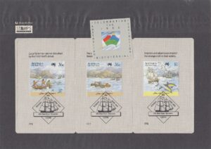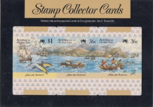 On 7 September 1987, Australia Post will release the first three sets of a five-set series of Stamp Collector Cards. Devised in the form of swap cards, these attractive items reproduce artwork from Australia’s Posts First Fleet series of stamps on one side, while on the other side the actual stamp is affixed and postmarked.