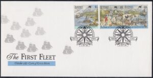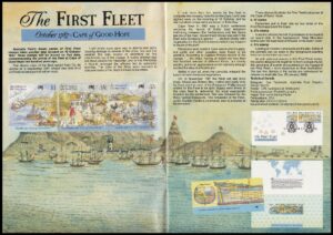 Australia Posts’ timely series of First Fleet stamps takes another step forward on 13 October 1987. Three stamps will be issued on that date, commemorating the arrival of the fleet at Cape of Good Hope two hundred years ago.