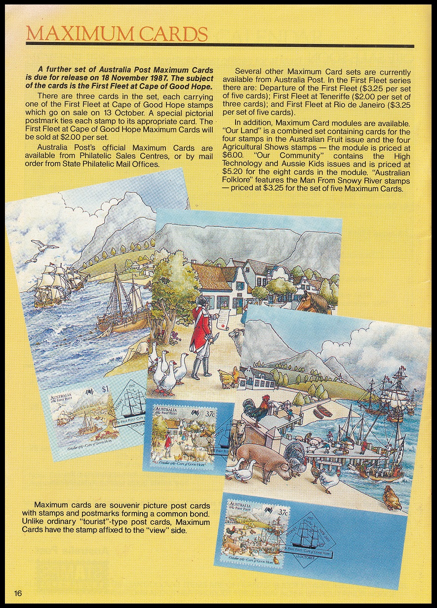 A further set of Australia Post Maximum Cards is due for release on 18 November 1987. The subject of the cards is the First Fleet at Cape of Good Hope.