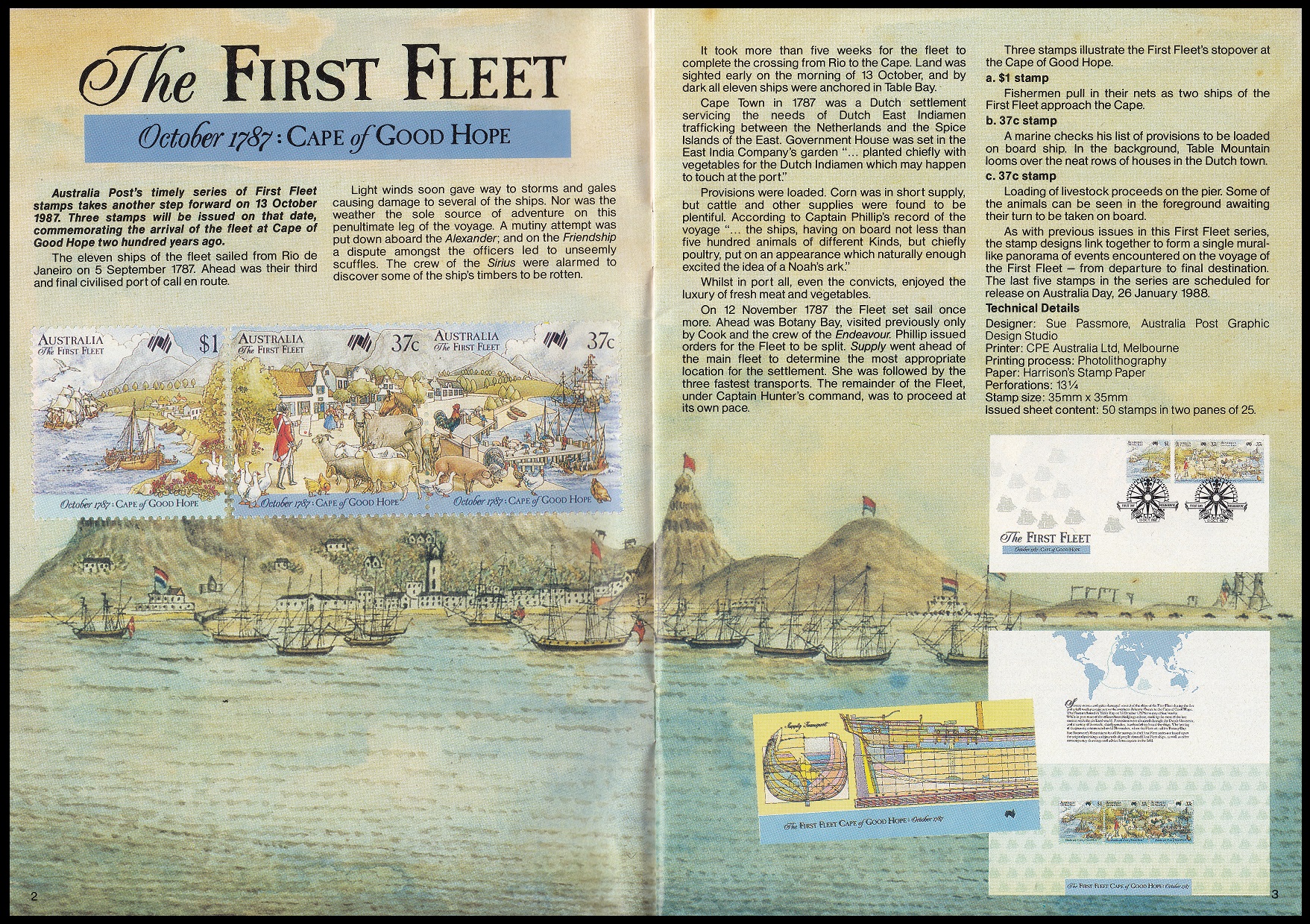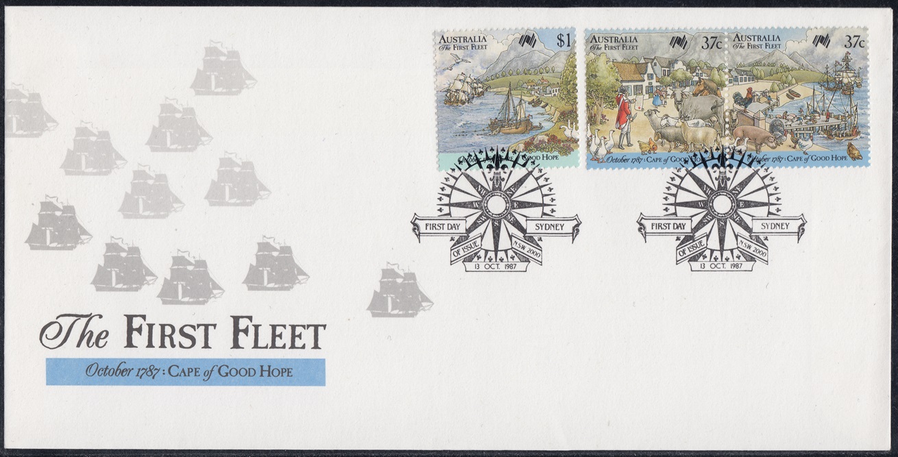 Australia Posts’ timely series of First Fleet stamps takes another step forward on 13 October 1987. Three stamps will be issued on that date, commemorating the arrival of the fleet at Cape of Good Hope two hundred years ago.