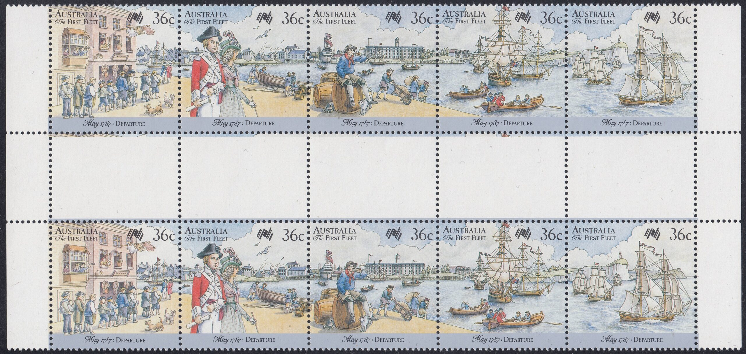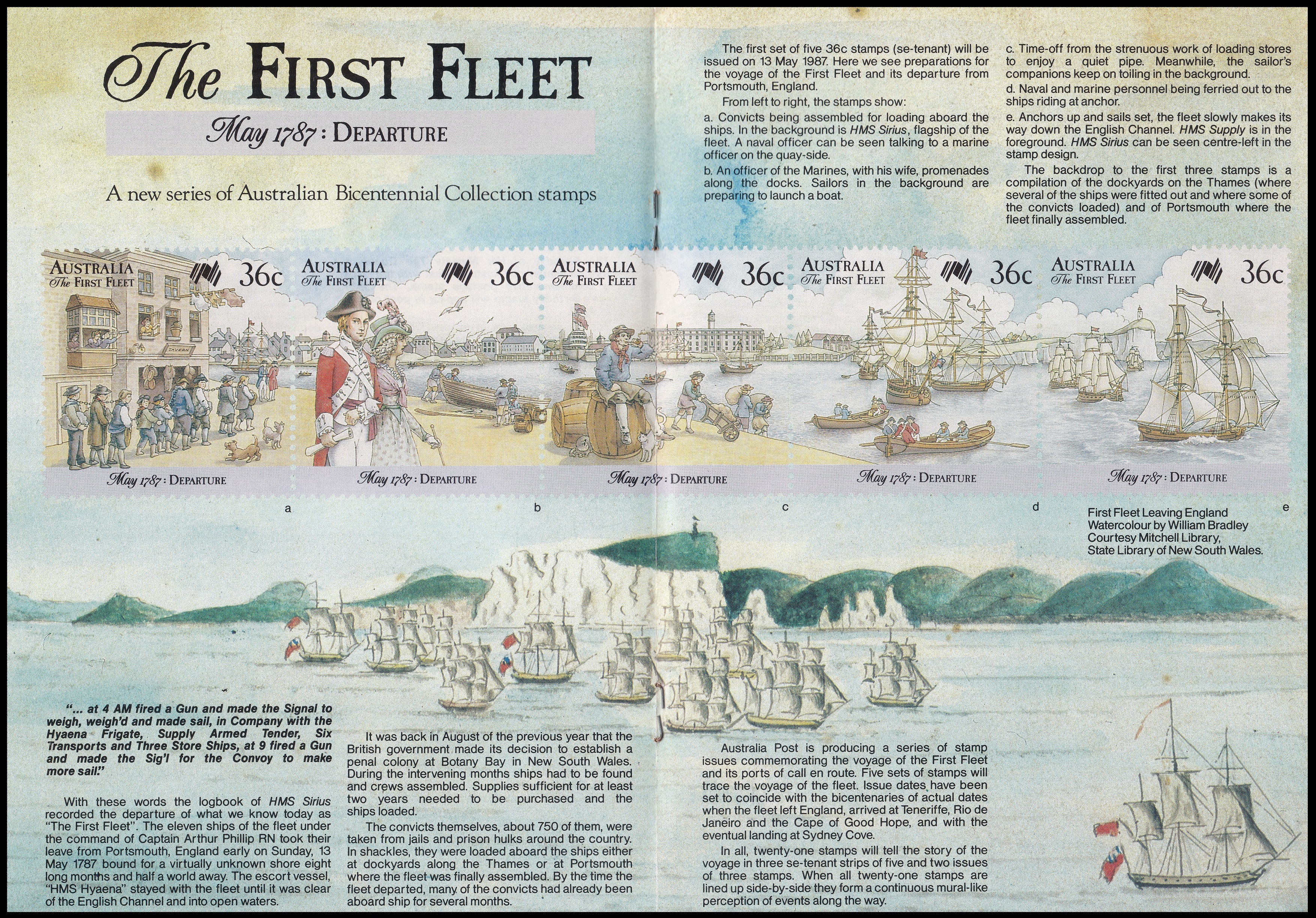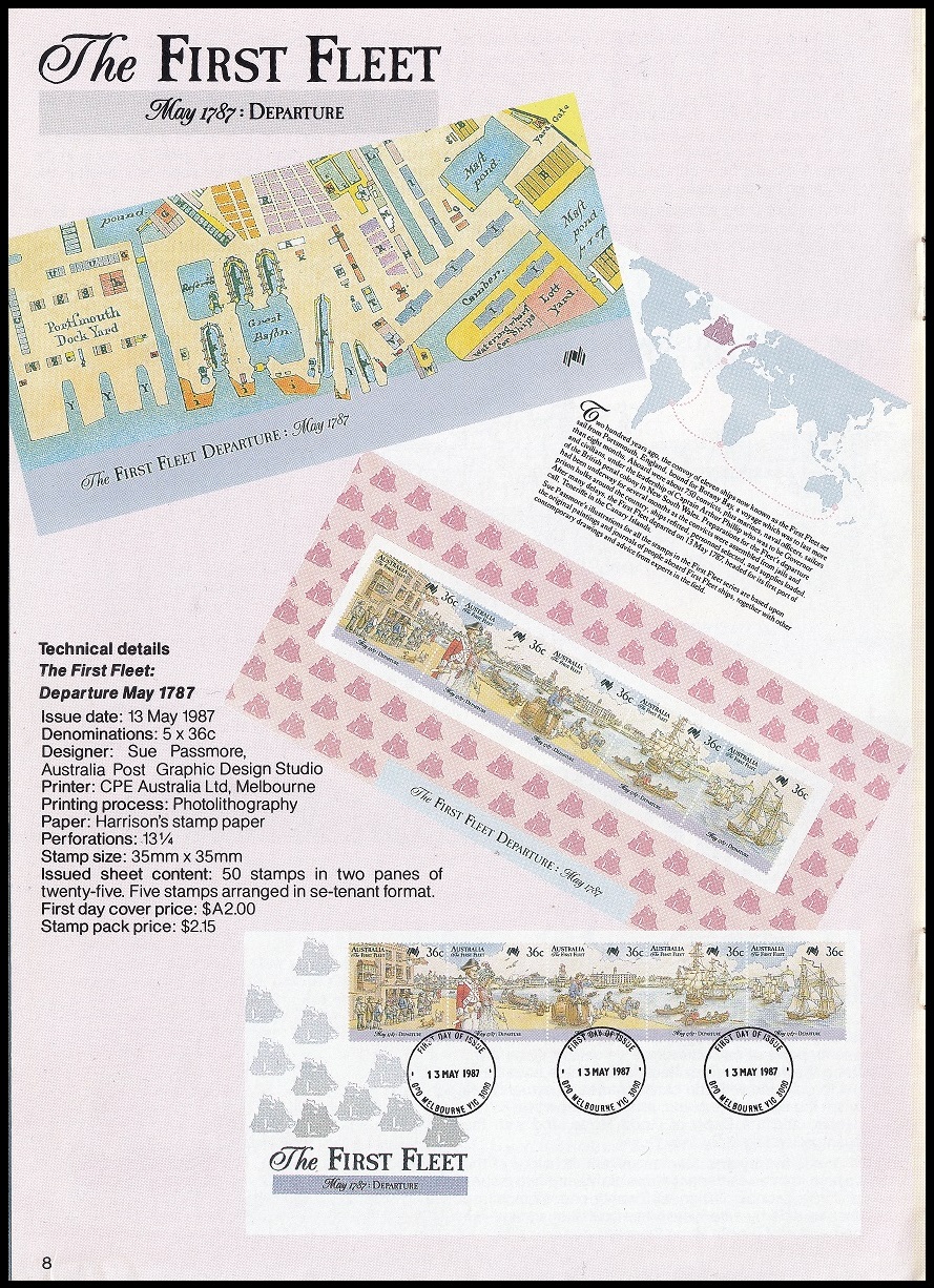 The first set of five 36c stamps (se-tennant) will be issued on 13 May 1987. Here we see preparations from Portsmouth, England. The background to the first three stamps is a compilation of the dockyards on the Thames (where several of the ships were fitted out and where some of the convicts loaded) and of Portsmouth where the fleet finally assembled.