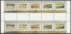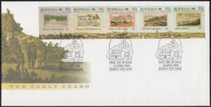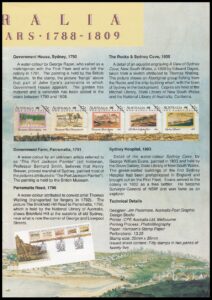 A panorama of Sydney Cover completed about 1808 by convict artist John Eyre is the unifying image in this set of five stamps. Five other views, also by early artists, depicting Sydney and Parramatta during the years 1790-1803 are displayed in the upper area of the stamps.