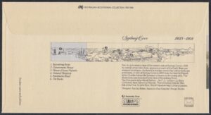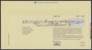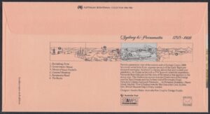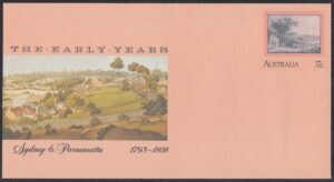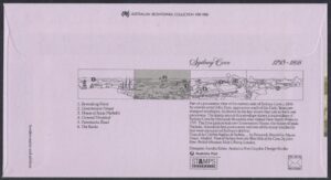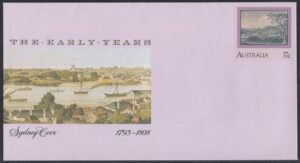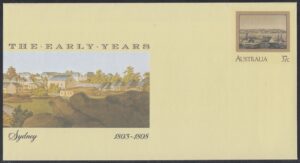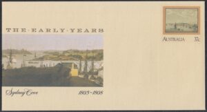 The four pre-stamped envelopes depict a View of Sydney from the West Side of the Cove, No.1 & No.2 by John Eyre.
