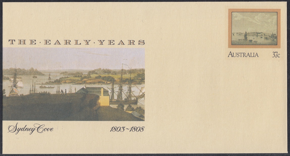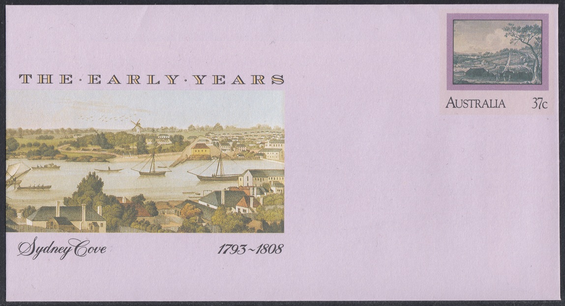 The four pre-stamped envelopes depict a View of Sydney from the West Side of the Cove, No.1 & No.2 by John Eyre.