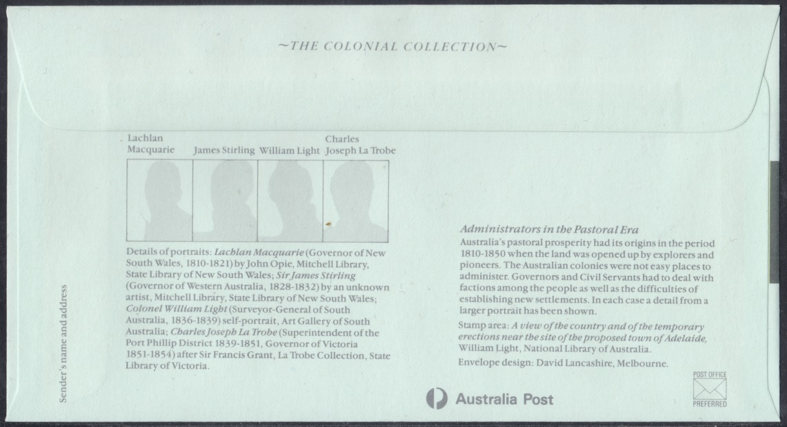 Australia’s pastoral prosperity has its origins in the period 1810-1850 when the land was opened up by explorers and pioneers. The Australian colonies were not easy places to administer. Governors and Civil Servants had to deal with factions among the people as well as the difficulties of establishing new settlements. In each case a detail from a larger portrait has been shown.