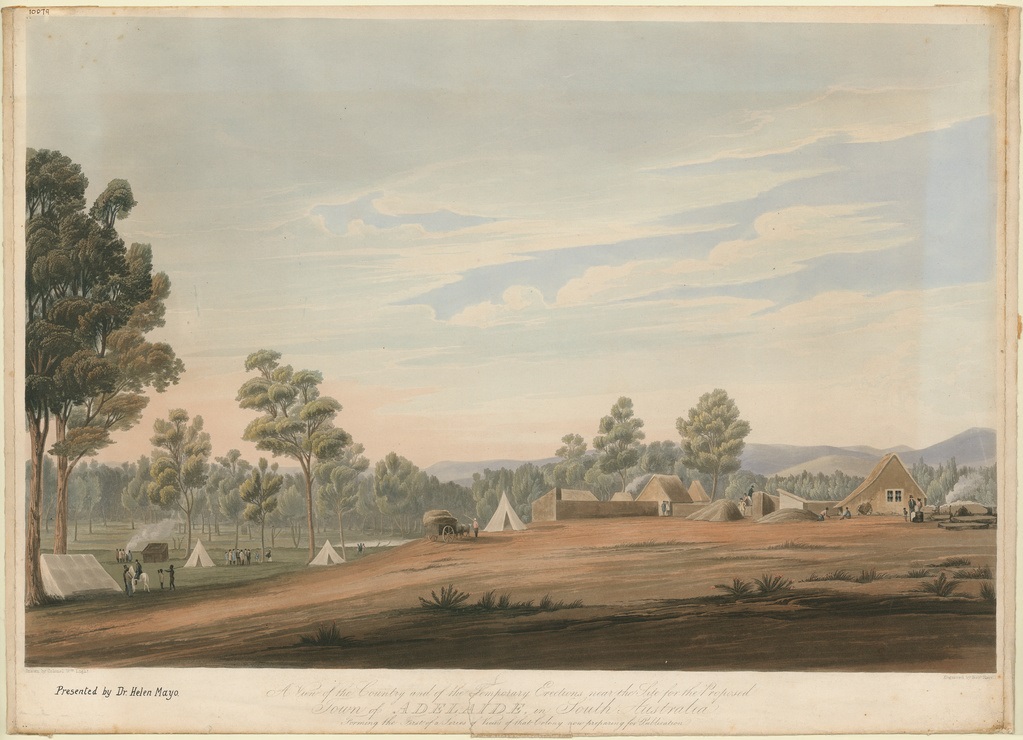 Stamp area: A view of the country and of the temporary erections near the site of the proposed town of Adelaide, William Light, National Library of Australia.