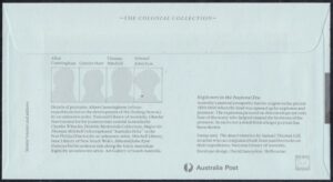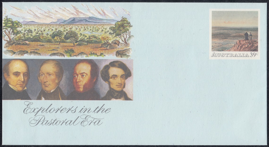 Australia’s pastoral prosperity has its origins in the period 1810-1850 when the land was opened up by explorers and pioneers. The explorers pictured on this envelope are only four of the many who helped expand the horizons of the pioneers. In each case a detail from a larger portrait has been shown.
