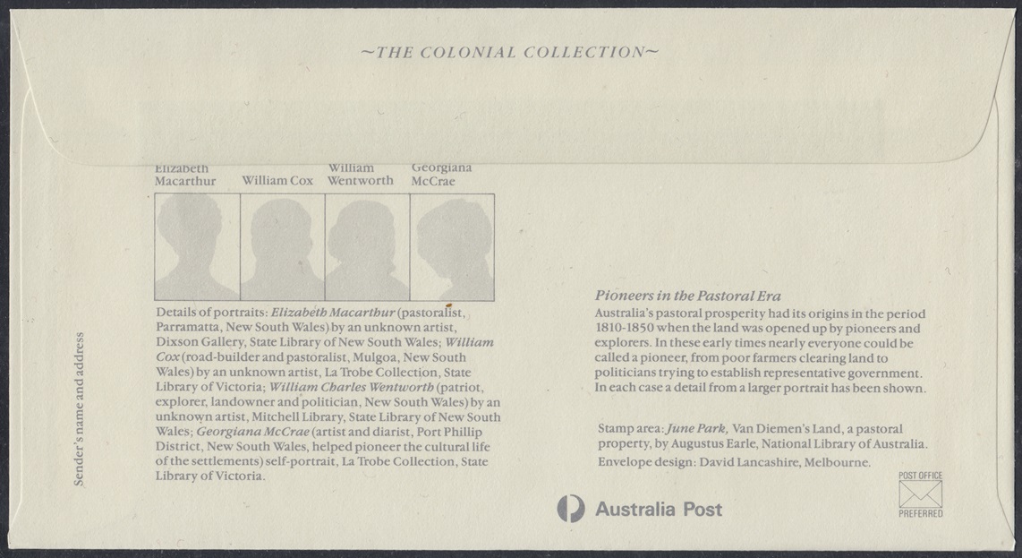 Australia’s pastoral prosperity has its origins in the period 1810-1850 when the land was opened up by explorers and pioneers. In these early times nearly everyone could be called a pioneer, from poor farmers clearing land to politicians trying to establish representative government. In each case a detail from a larger portrait has been shown.