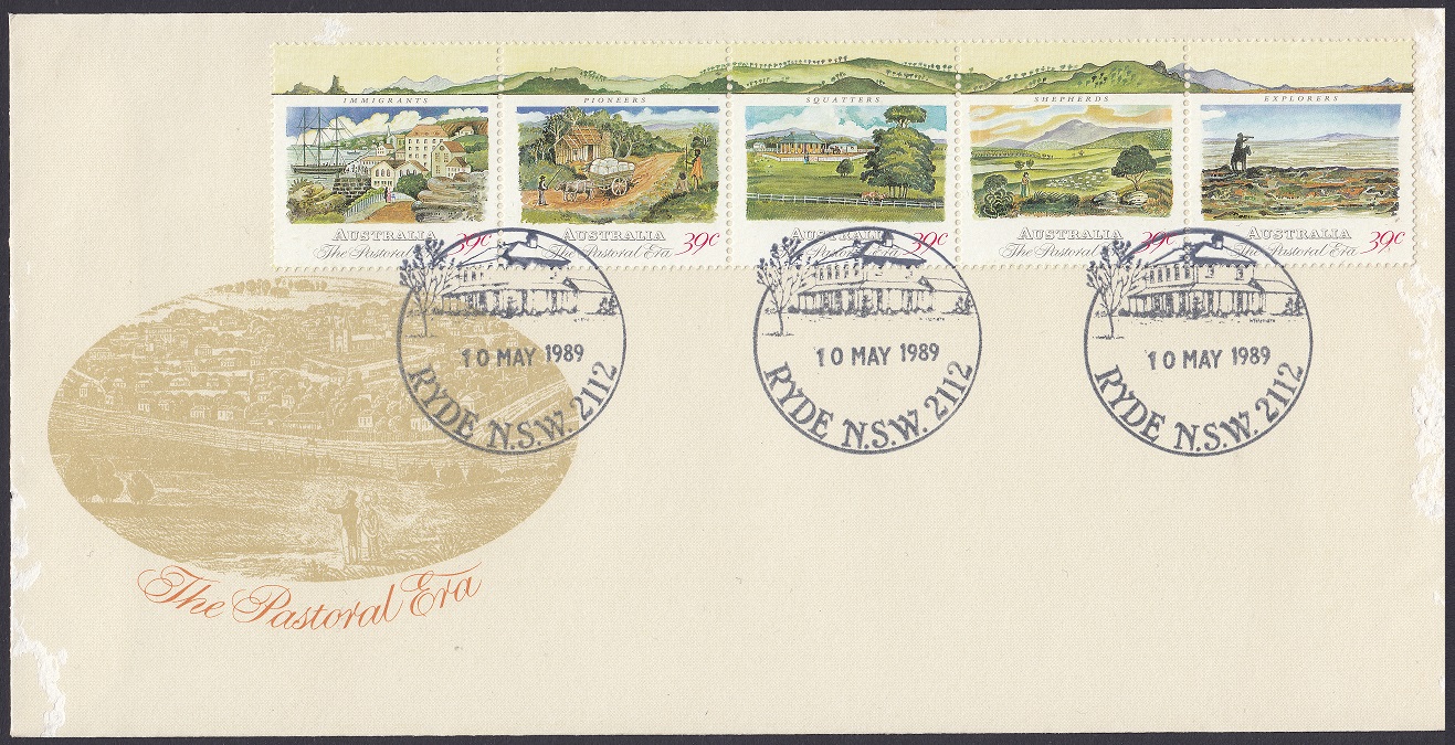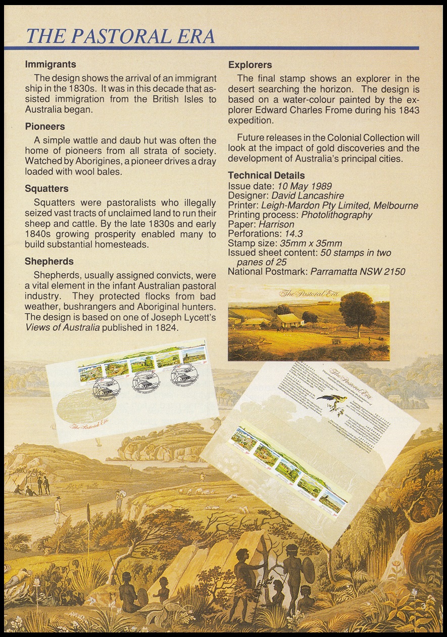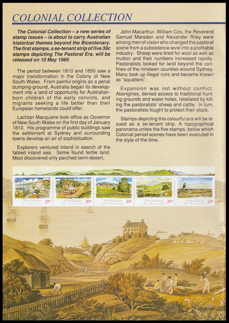 The Colonial Collection – a new series of stamp issues – is about to carry Australian historical themes beyond the Bicentenary. The first stamps, a se-tenant strip of five 39c stamps depicting the The Pastoral Era, will be released on 10 May 1989.
