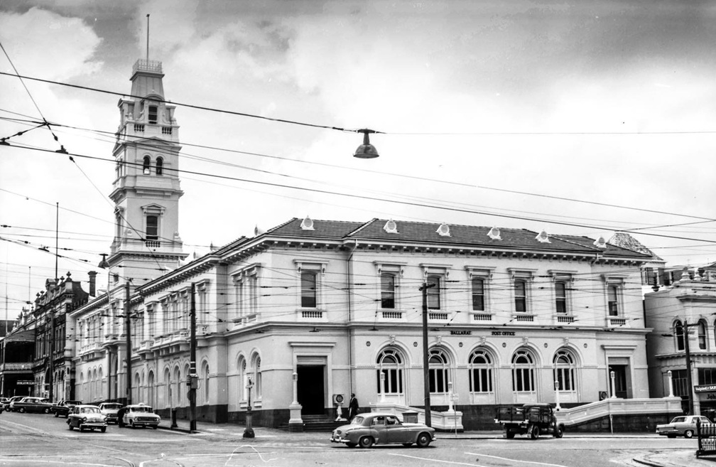 Ballarat post office was located on the corner of Sturt Street and Lydiard Street. The first of a two stage building was opened on 28 November 1864, in the Italianate palazzo style. In 1871, a telegraph office and treasury was added to the Lydiard (north) Street frontage. A clock tower and offices, including a carriageway entrance, were added in 1885.