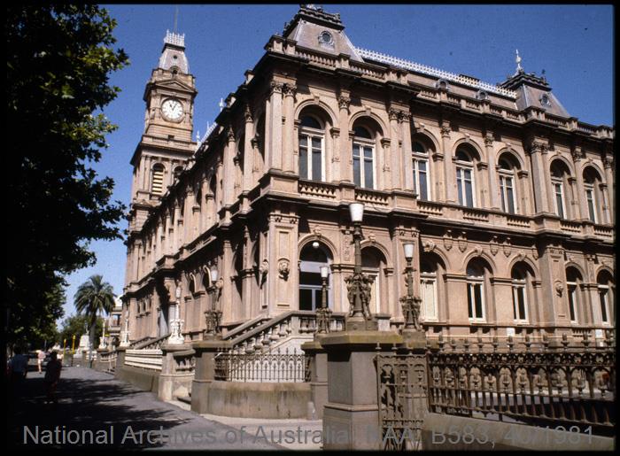 The Bendigo Post Office, Victoria, was built between 1883 and 1887 by the contractors McCulloch and McAlpine and designed by Public Works architect George W. Watson in the Second Empire architectural style. The building shares a great deal with its neighbouring building, the Bendigo Law Courts, and had the same builder and designer and was built at around the same time.
