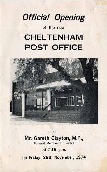A new post office was opened at Cheltenham on 29 November 1974. It was designed and supervised by the Department of Housing and Construction. Documentation of the project was by Oscar A. T. Gimesy and Associates. The building was constructed by T. W. Morris and Son Pty Ltd of Mordialloc at a cost of $185,684.