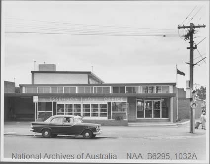 The new Essendon post office was opened in November 1964 at a cost of £32,000. The office used bright, corrosion resistant aluminum for the rows of telephone cabinets facing the street, the front doors and window surrounds, interior partitions, light fittings and furniture. The new post office was constructed on the site of the older building.