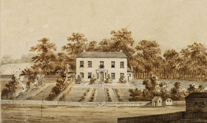 Governor Phillip‘s original cottage was located on the hill above the Crescent at Rose Hill. It was built using convict labour. The extensive garden setting of the building, as well as its prominent position, with a view over the township, gave some status to what was essentially a cottage. Although the governor’s residence was somewhat larger, and had less occupants, it was similar in form to the vernacular cottages built to accommodate the convicts. It was mainly constructed from locally sourced materials such as timber, ‘wattles’ and clay or mud. The hip roof form used was either a thatched, bark or shingle roof and timber rafters.