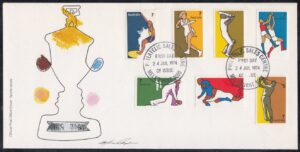 The new Centre is provided with a pictorial postmarker, and a souvenir cover showing the amorial bearings of the City of Melbourne. On the first day of use of the postmarker, a number of covers were cancelled, for sale while stocks last. Postmarked covers were prepared in two forms: one bearing the 40c Como House Melbourne postage stamp, and the other bearing the 7c Queen Elizabeth II stamp. After stocks of of these are exhausted, collectors will be able to obtain the souvenir cover with any valid stamps of their choice, and cancelled with the date of purchase.